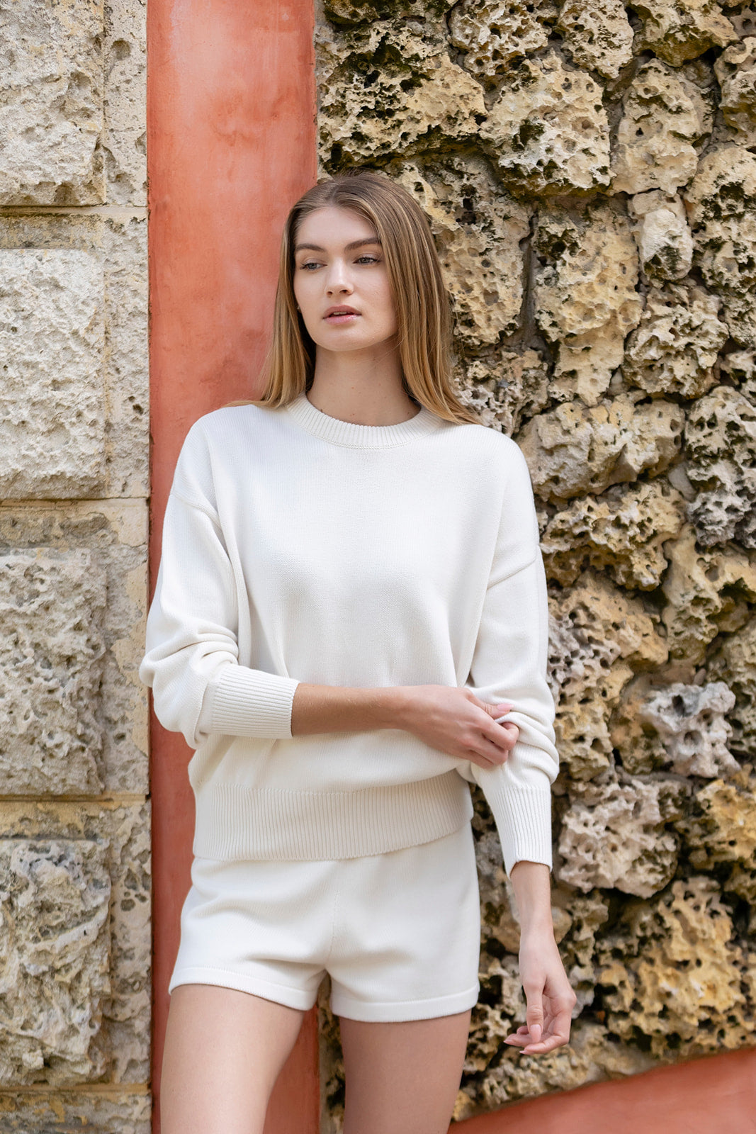 Meet the Falmouth Sweater, your new crewneck sweater uniform. Invoking classic Americana that is equal parts versatile, chic and comfortable, you will be reaching for her all year round. Made of 100% Cotton and featuring a relaxed fit, ribbed cuff, crew neck and hem. We love her paired with the matching Falmouth Shorts, Bell Pants or jeans.