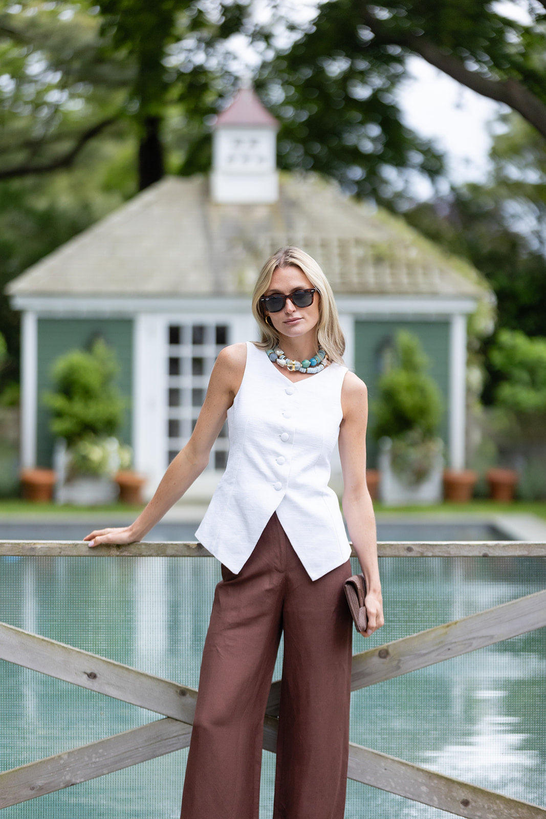 Introducing the Tess Vest, our vest top inspired by classic menswear with a modern and distinctly feminine twist, now in cotton slub. She features a fitted and slightly longer silhouette in the front than back, a v-neck, and silk-covered button front. The Tess Vest pairs perfectly with the Summer Julia Pant or Gidget Cotton Slub for a fun and dare we say *slightly sexy* summer outfit.