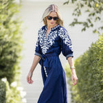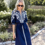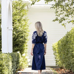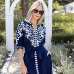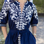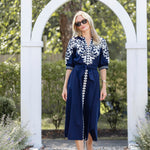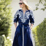 The new Cordelia Coatue Dress is equal parts cute and effortless, featuring rich embroidered floral detail and dot piping, she's perfect for an elevated day out or dressed up for a casual evening. A flowy, slightly A-line silhouette with a coordinating tie belt. Sleeves do not feature an elastic banded arm. Unlined but not sheer. 100% Cotton Poplin.