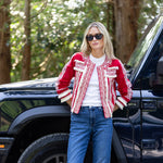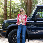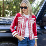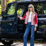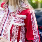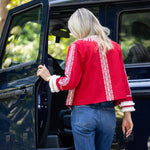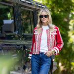 The Fringe Jacket is a chic open-front jacket with embroidery and fringe detail throughout. We're loving the Fringe to spice up a t-shirt and jeans fall outfit or with a black cigarette pant and jewelry for a pulled-together but fun evening look. The Fringe Jacket is made of 100% cotton with geometric-patterned embroidered stitching and fringe detail along the front opening, collar, and wrist hems. Features two hidden hook-eye front closures. Hits at the hip.