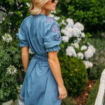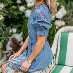 The short version of our best selling caftan with updated rich geometric floral detail and dot piping. Designed for a sophisticated day look or dressed up for a casual evening out. The Coatue Mademoiselle features a flowy silhouette with a coordinating tie neck closure and tie belt.