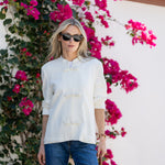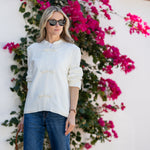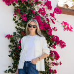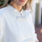 The Mandarin Jacket - now in Linen - is a chic mandarin collared jacket with front knot frog closures. We're loving the Mandarin to spice up a tippi and jeans daytime outfit or with a black cigarette and jewelry for a pulled-together but fun evening look. Hits below hip.