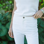 The bestselling Bell Pant in White, our effortlessly chic basic white pant, now in Twill (she has the same hint of stretch but a little more give than the original canvas fabrication). The cropped pants feature a supremely flattering subtle kick-flare. Slightly tidier than denim, the Bell Pants do not have pockets or belt loops to make them a sleeker silhouette and your ultimate summer daytime outfit canvas.
