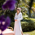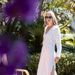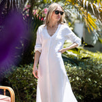 Meet the Chloe Caftan, a long linen caftan with rich floral embroidery detail throughout, a v-neck, button-up front, and side slits for easy movement. We love her because she's chic enough to wear to dinner with some sandals and jewelry but also easy enough to wear over a swimsuit (so basically the perfect vacation piece). Made of 70% linen, 30% viscose blend.