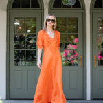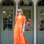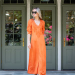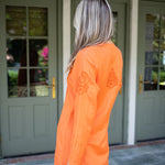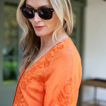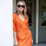 Meet the Chloe Caftan, a long linen caftan with rich floral embroidery detail throughout, a v-neck, button-up front, and side slits for easy movement. We love her because she's chic enough to wear to dinner with some sandals and jewelry but also easy enough to wear over a swimsuit (so basically the perfect vacation piece). Made of 70% linen, 30% viscose blend.