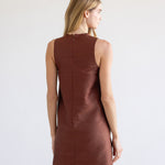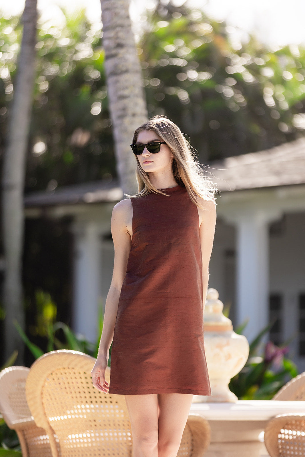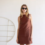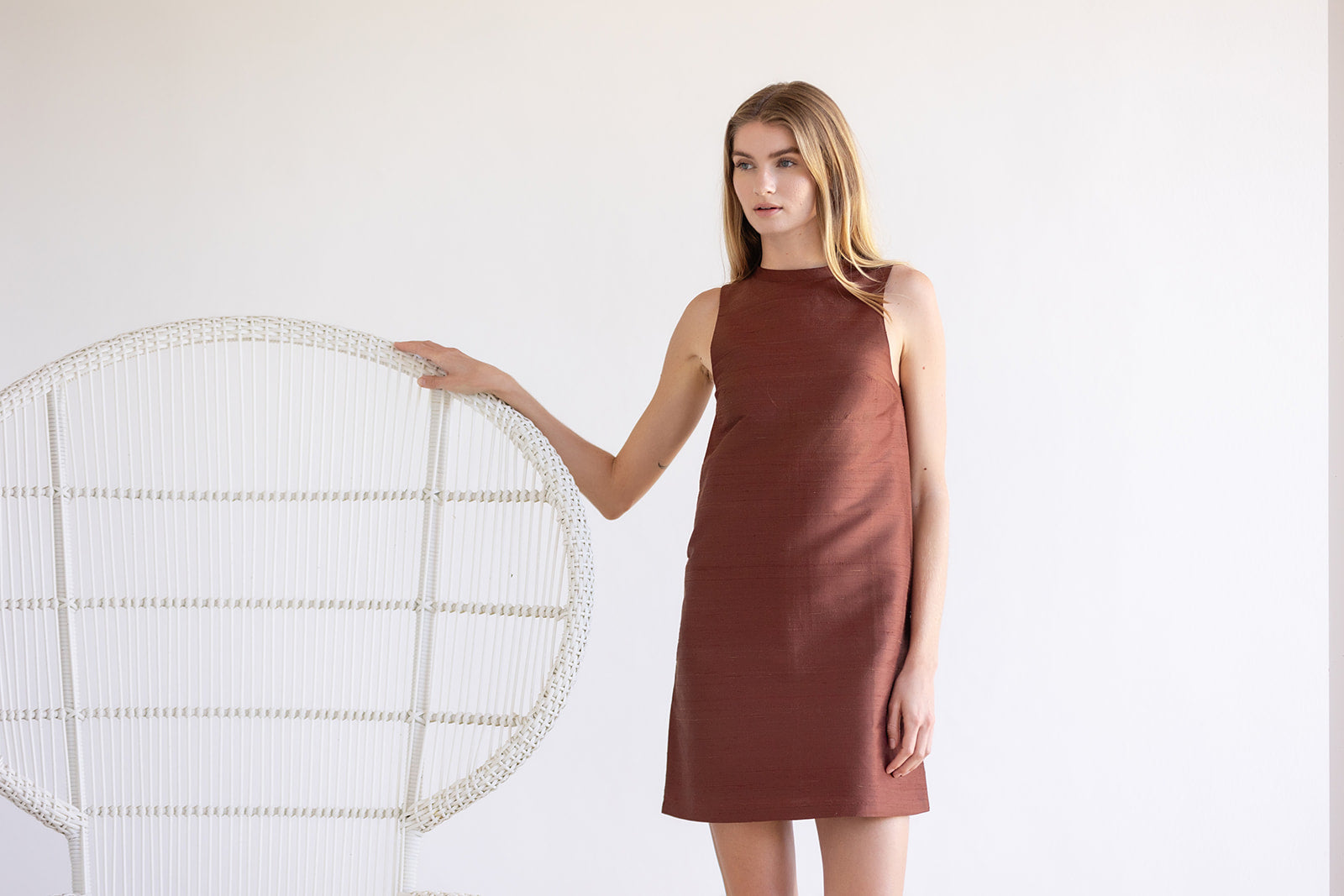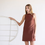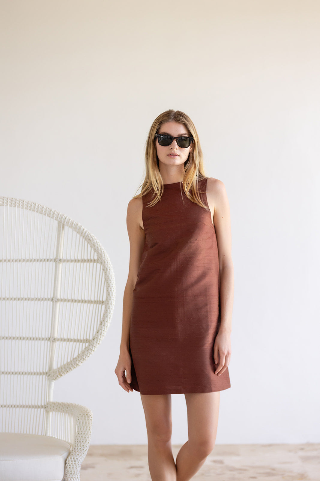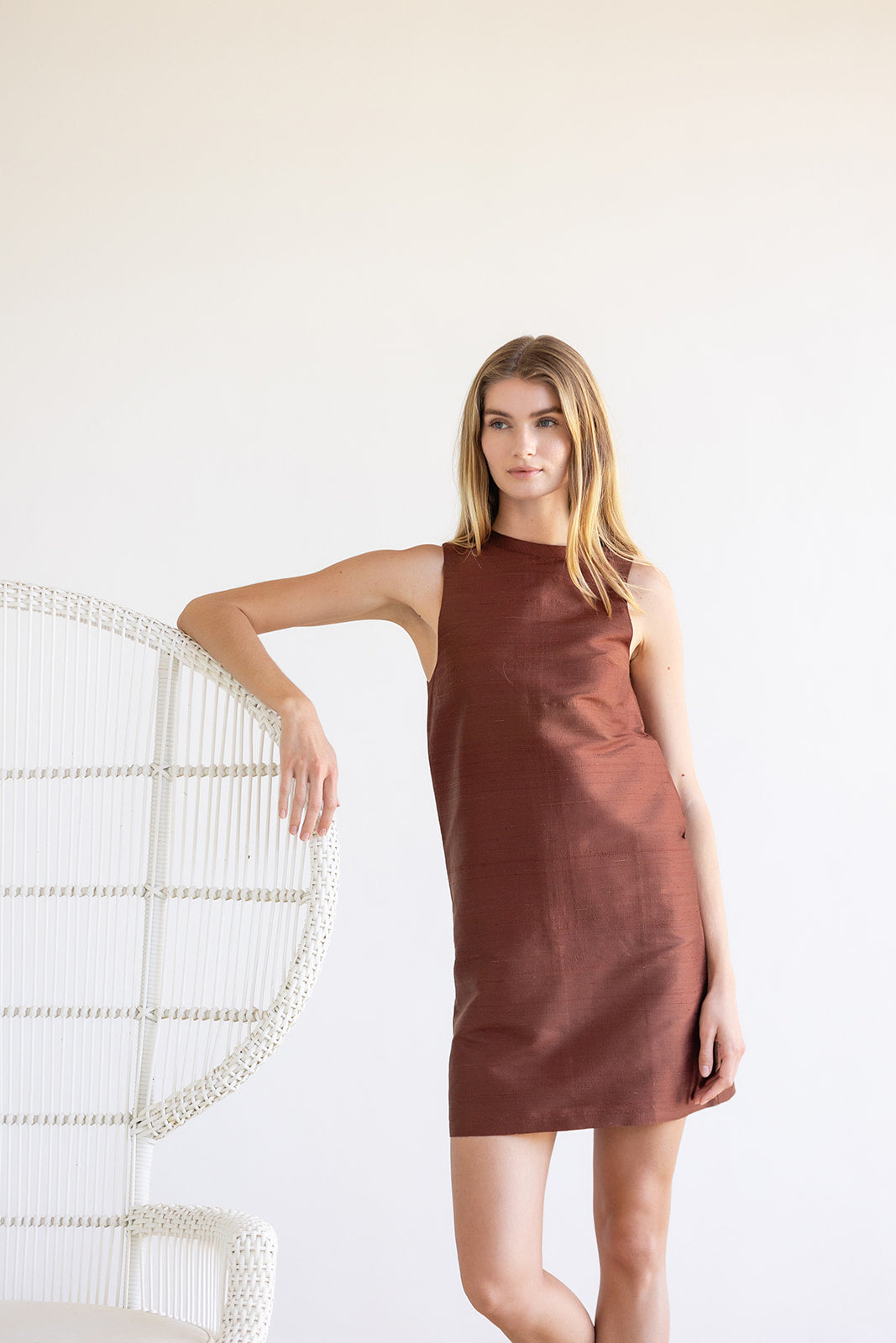 Meet the Nora Dress, a sleek sleeveless shift crafted in crisp silk for effortless warm-weather elegance. Designed with a minimalist high neckline and a straight, flattering silhouette, the Nora is cut to a chic mini length that feels both timeless and modern. An easy pull-on style with clean lines and subtle structure, it’s the perfect statement piece for daytime occasions or evening events with a simple change of accessories.