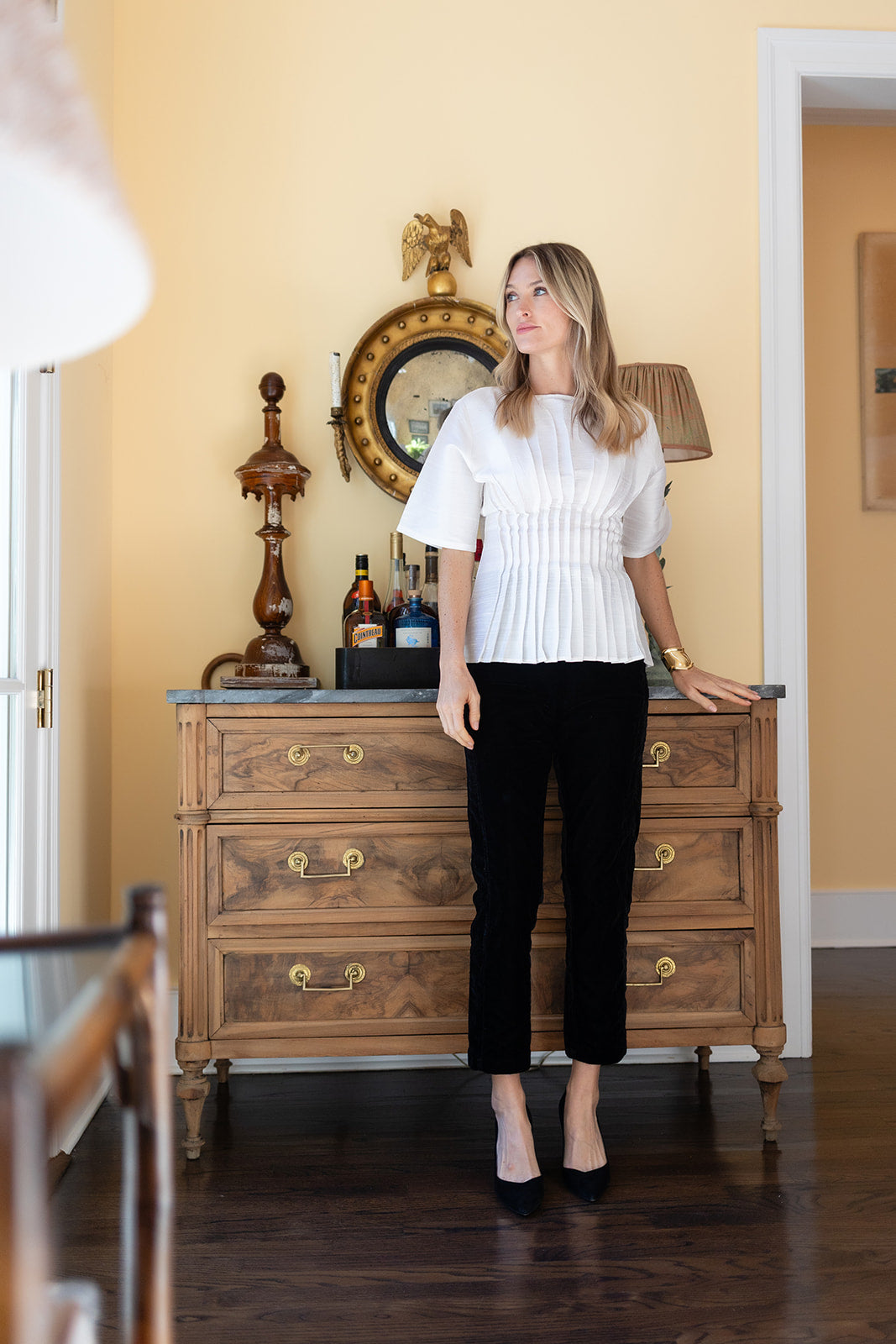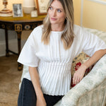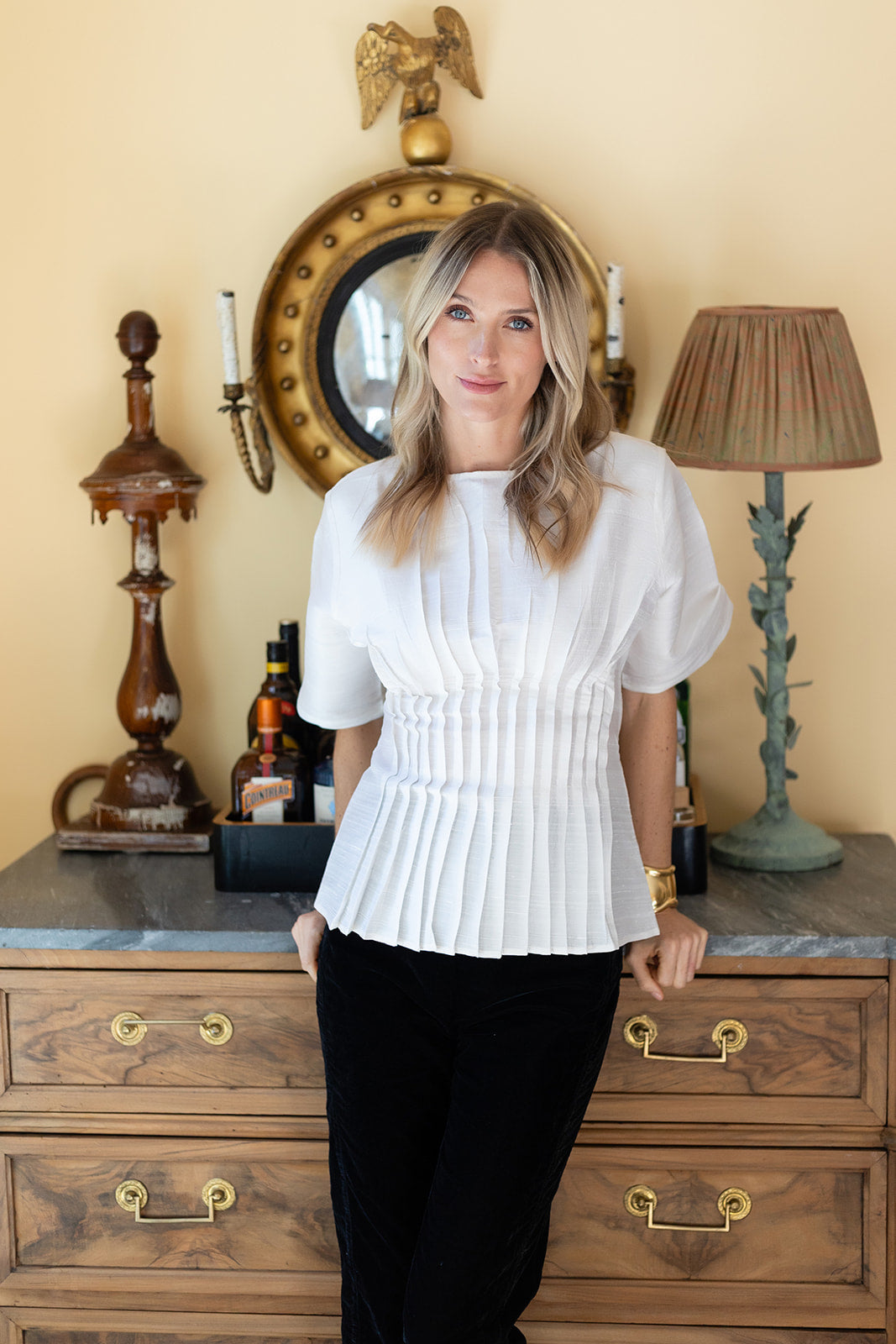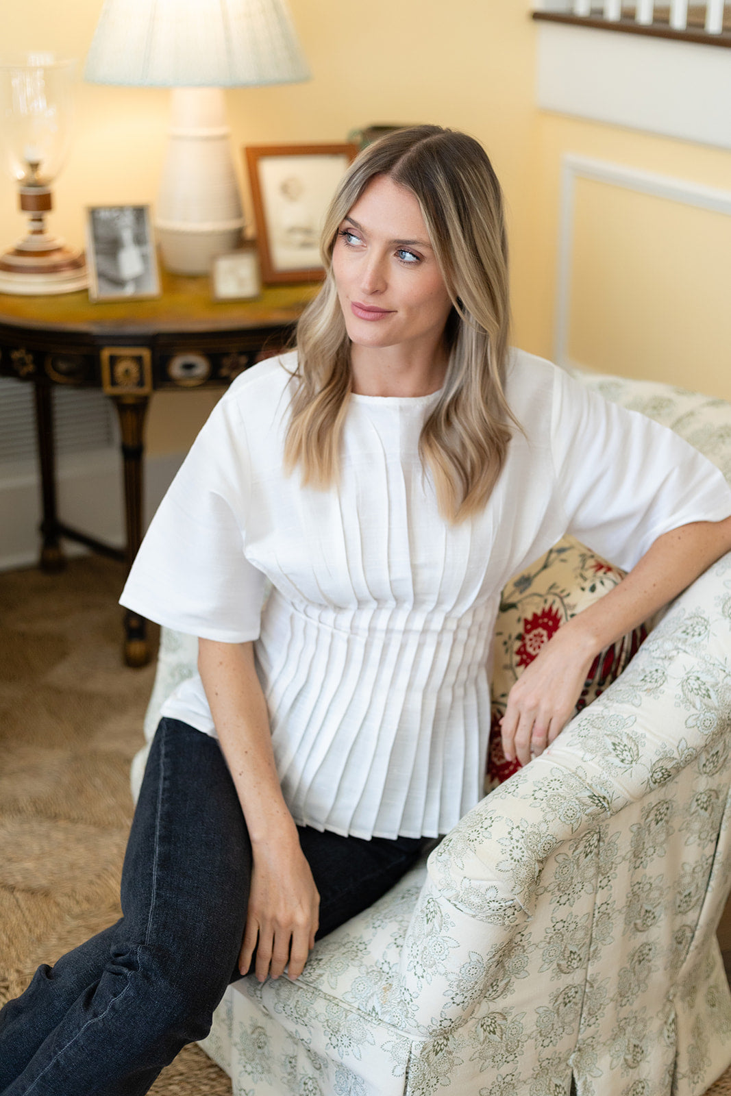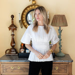 Meet the Emma Top, an elegant and modern peplum pintuck top in Dupioni silk. The top features an ultra-flattering corseted waist and short sleeves, and keyhole neck closure in the back. Hitting below the waist, she pairs perfectly with the Jackie or Julia Pants for an evening ensemble or denim for a cooler, night-out-in-the-city look.
