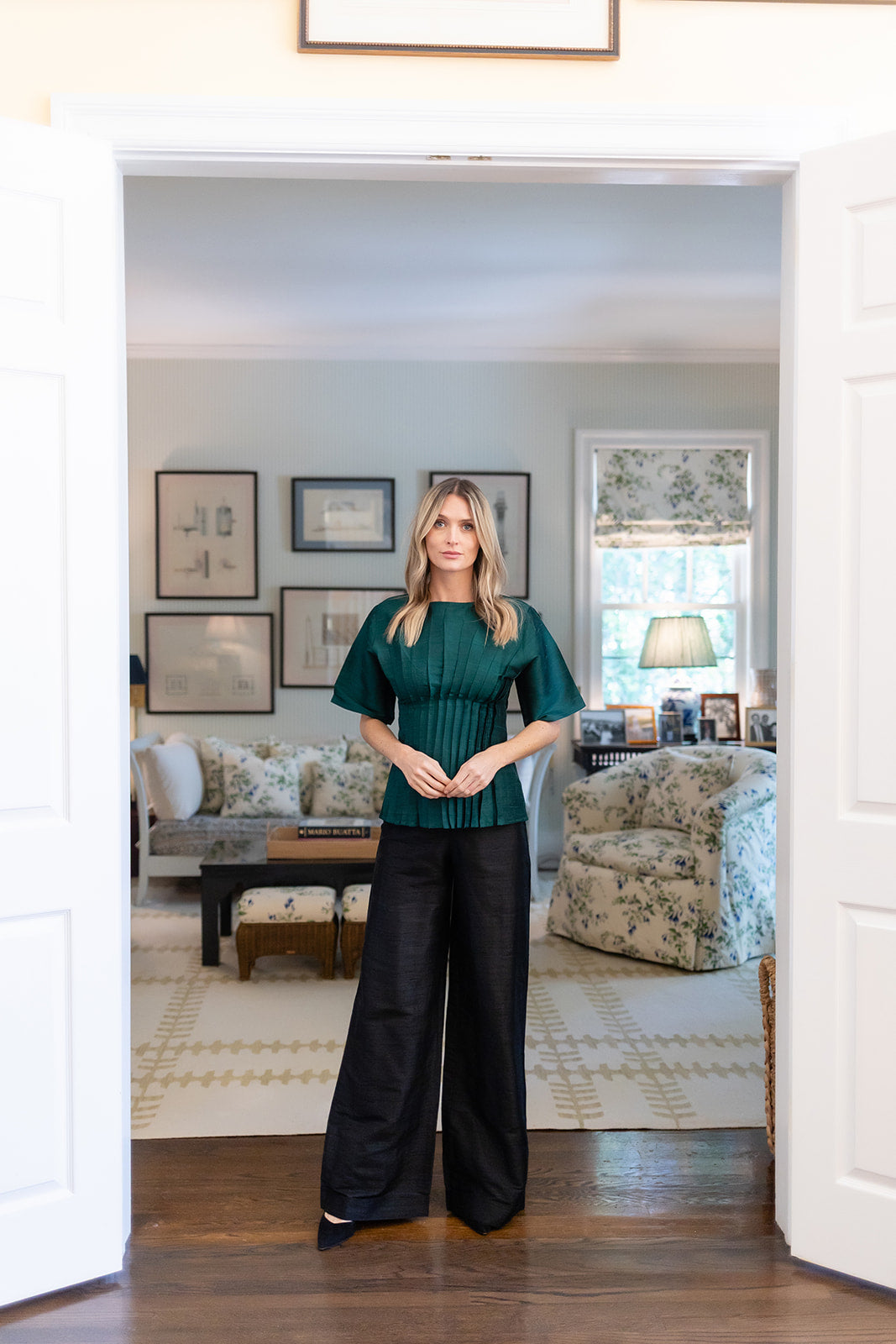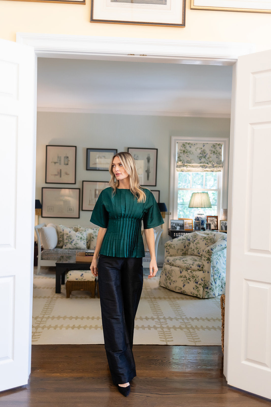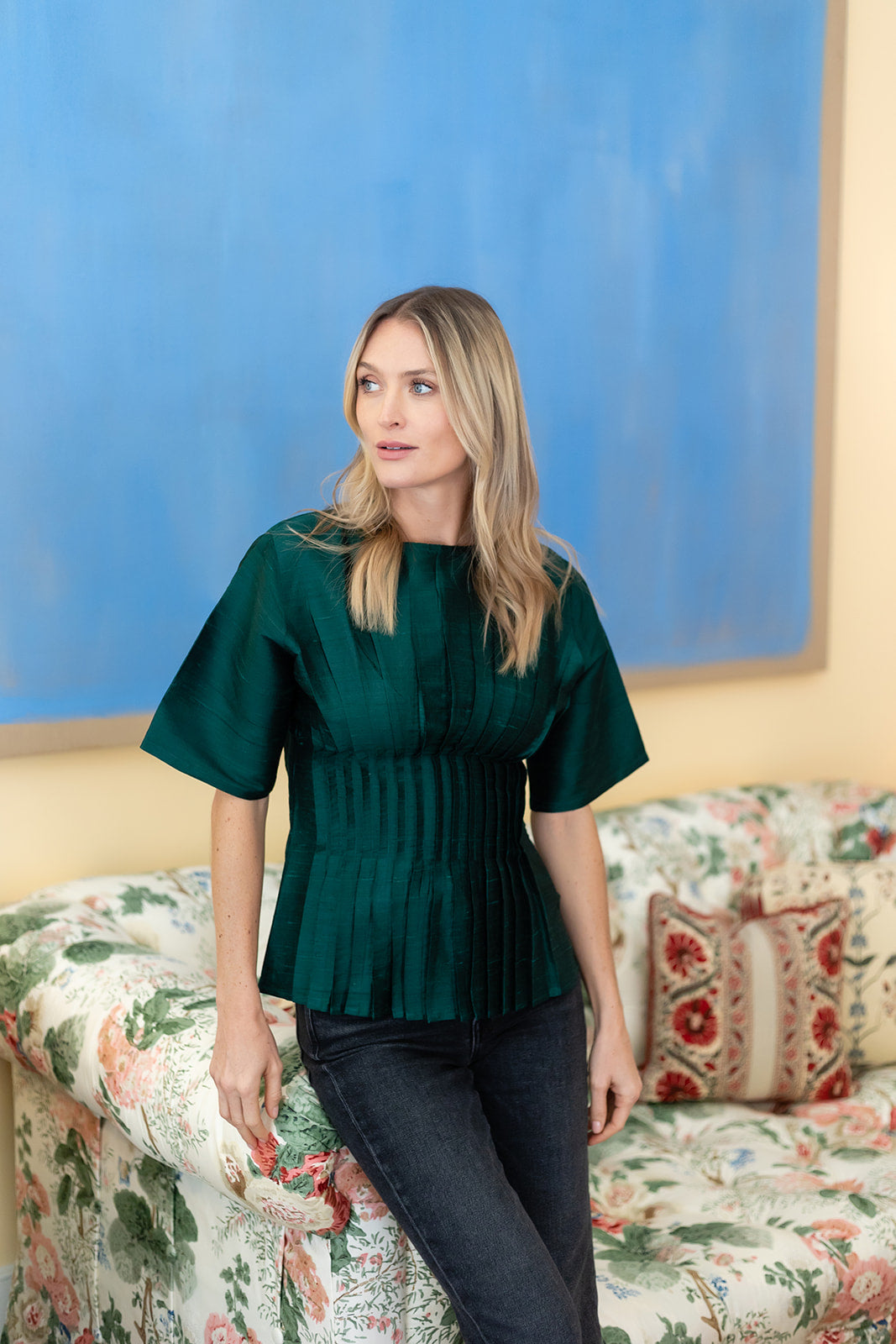 Meet the Emma Top, an elegant and modern peplum pintuck top in Dupioni silk. The top features an ultra-flattering corseted waist and short sleeves, and keyhole neck closure in the back. Hitting below the waist, she pairs perfectly with the Jackie or Julia Pants for an evening ensemble or denim for a cooler, night-out-in-the-city look.
