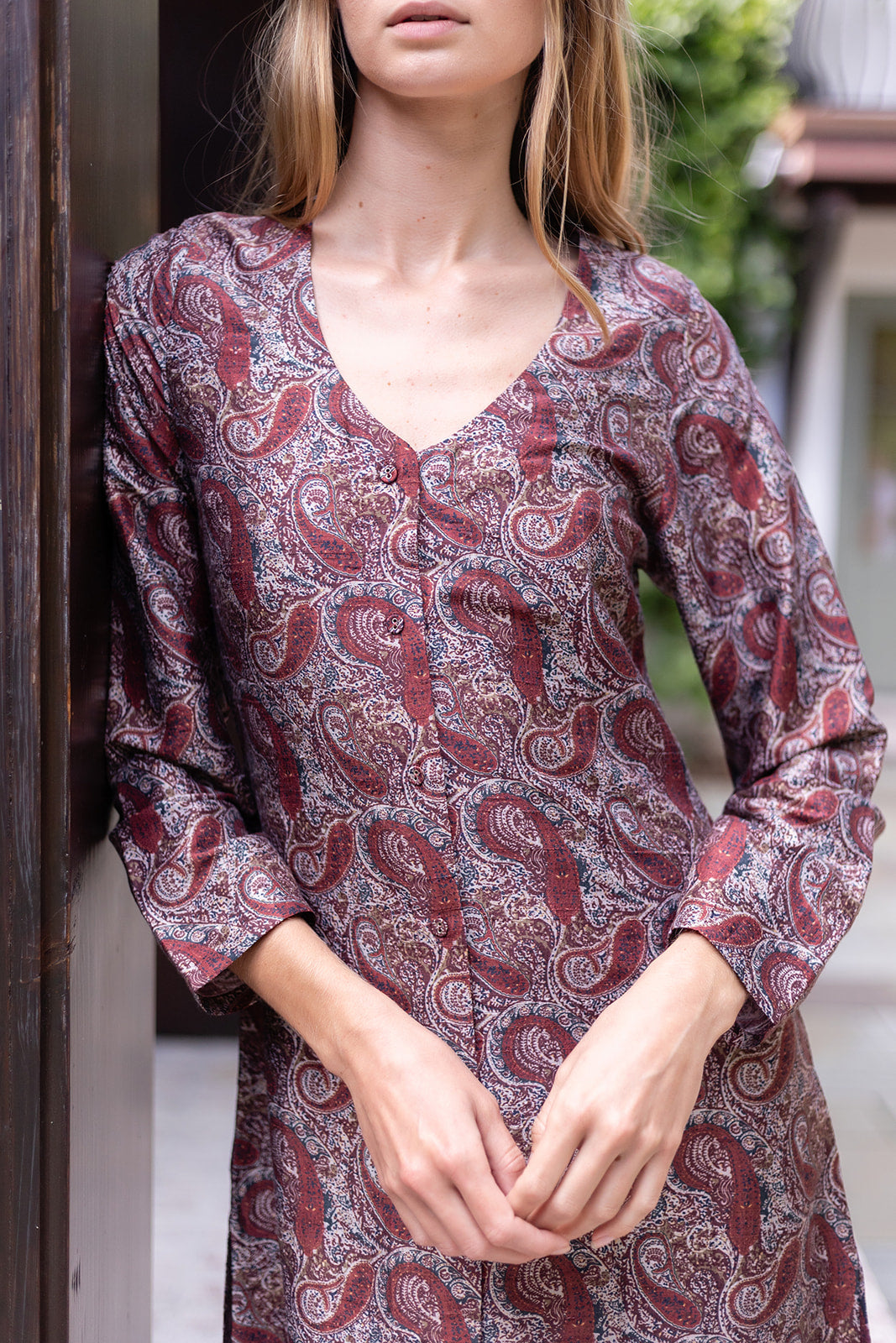 Meet the Gabriella dress, an elevated long caftan in silk Dupioni with a v-neck, button-up front, and side slits for easy movement. Inspired by our best selling Chloe Caftan, the Gabriella dress is your chic, no-thought-required option for warm evenings on vacation.