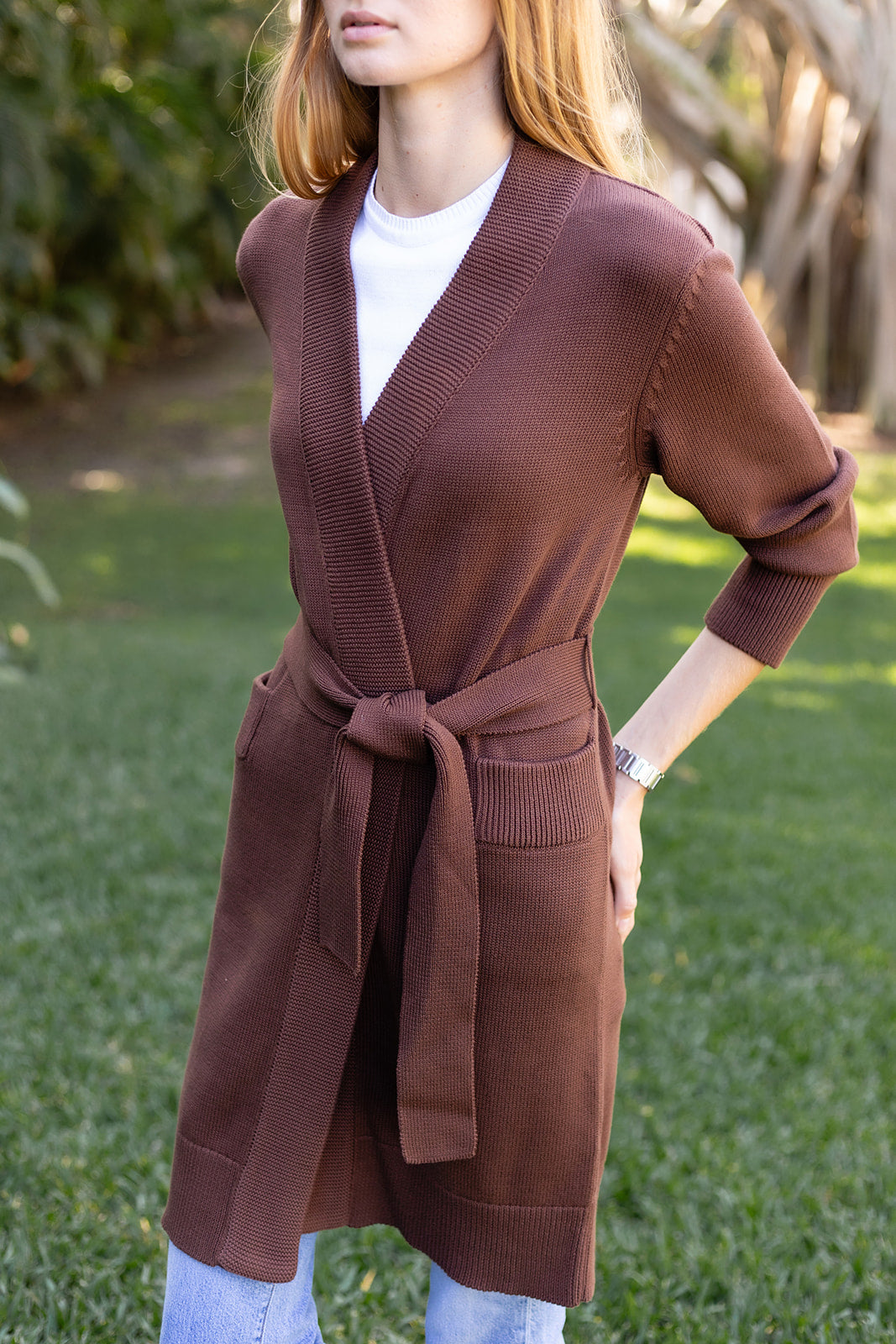 Meet the Falmouth Wrap Sweater, the newest addition to the Falmouth knit family. Inspired by the coziest Nancy Meyers movies (our thoughts are it's 'It's Complicated' for West Coasters and 'Something's Gotta Give' for East), she is your new elevated and effortless go-to. Made of 100% Cotton knit and featuring a coordinating belt. We love her paired with Bell Pants or jeans.