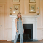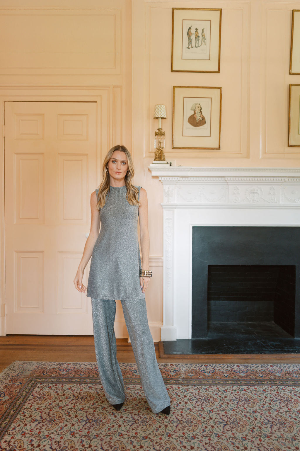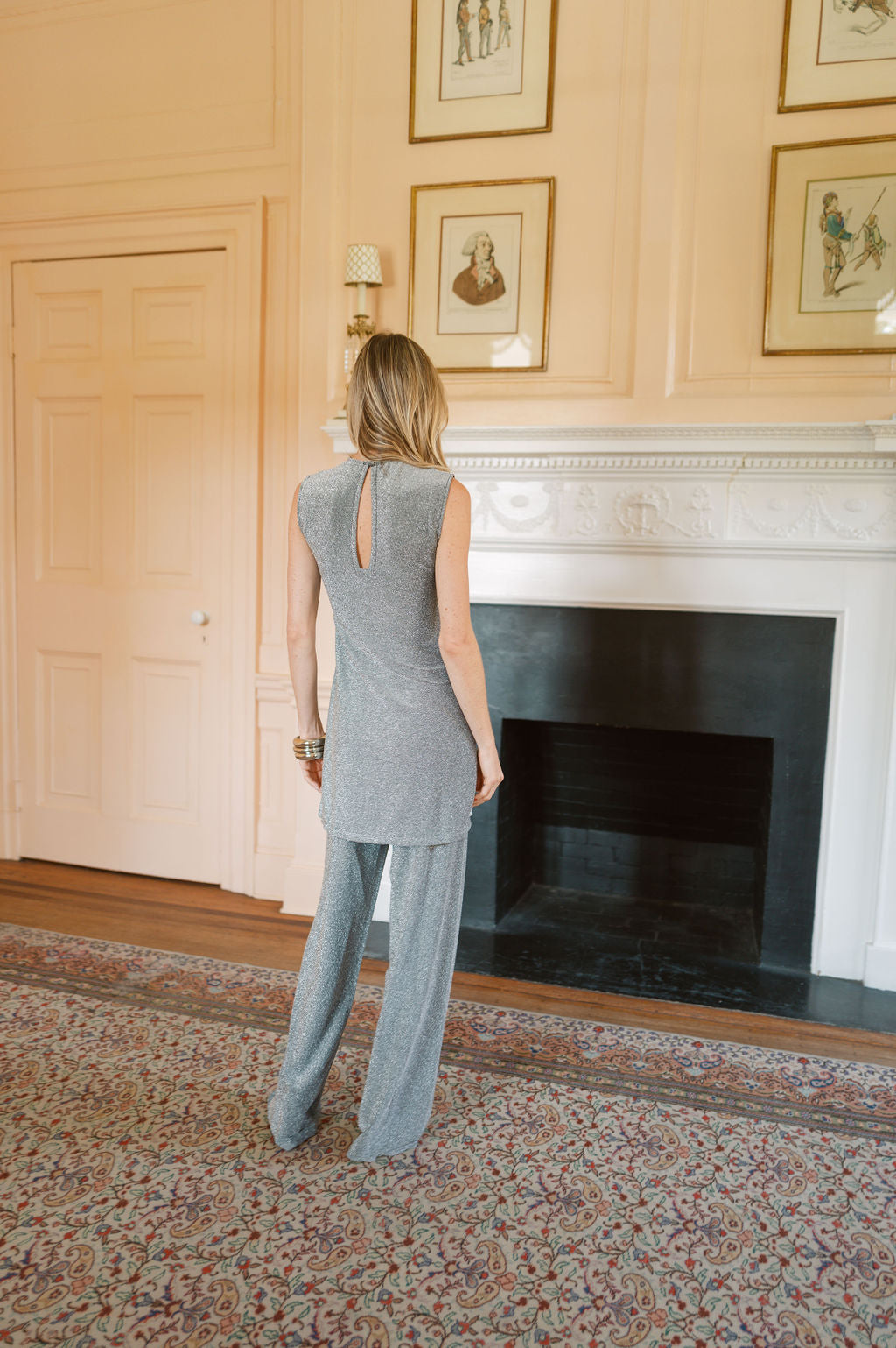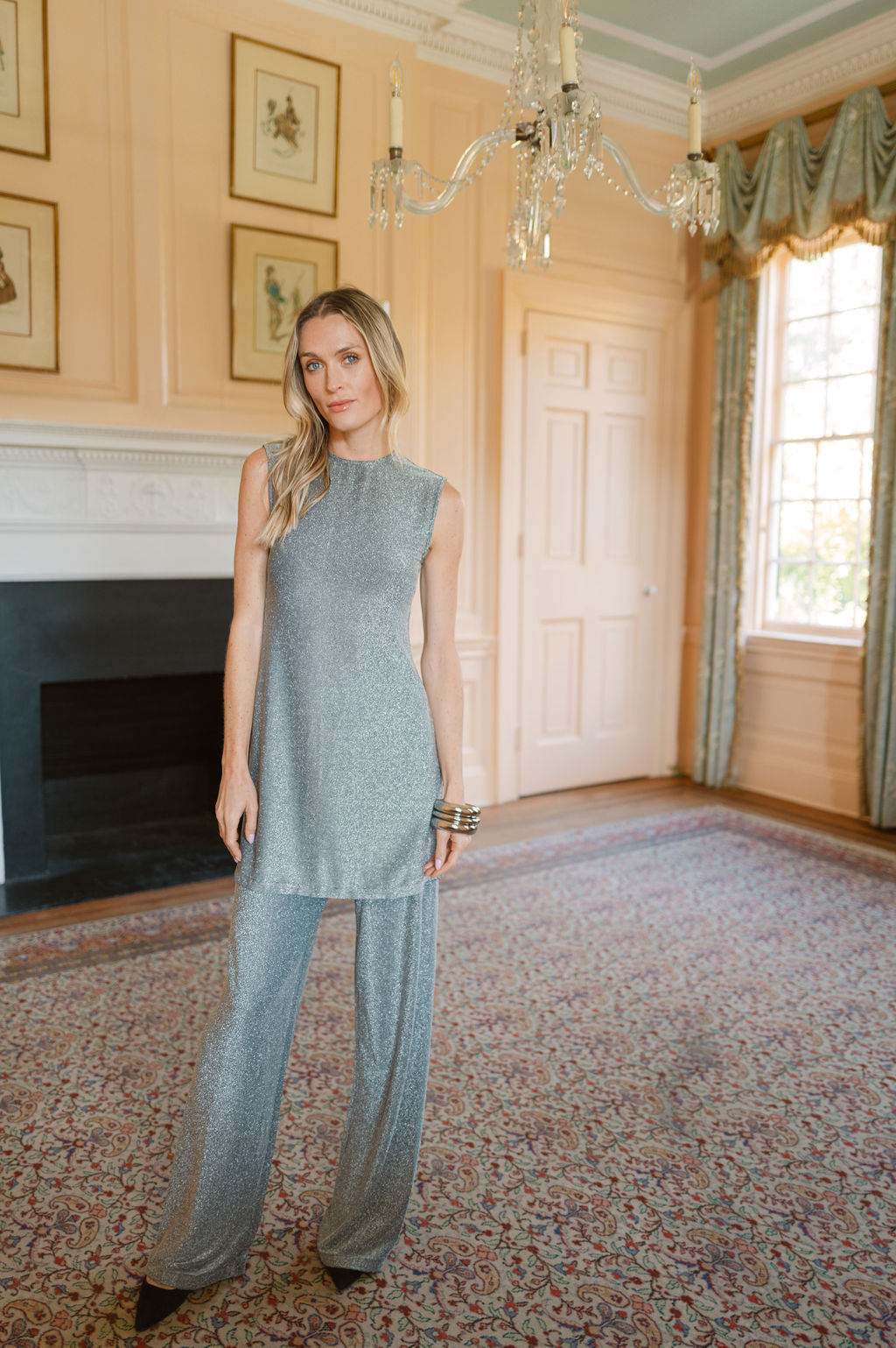A seventies-inspired disco set that's as cool as it is effortless. A long, sleeveless top in a slightly sparkly, metallic stretch fabric. Designed to pair with the Metallic Pant in Noir. Throw on some fun earrings and platform heels and your holiday party outfit is complete! See you on the dance floor.