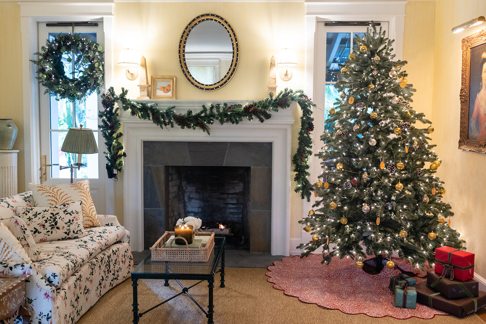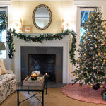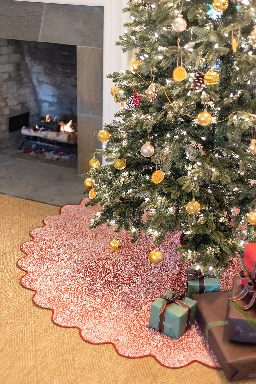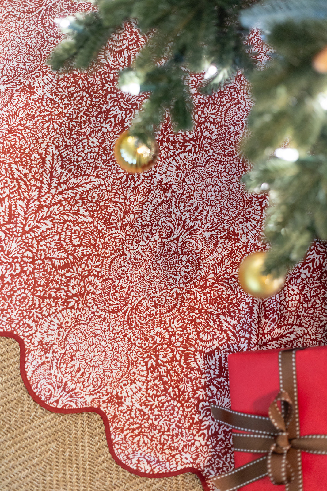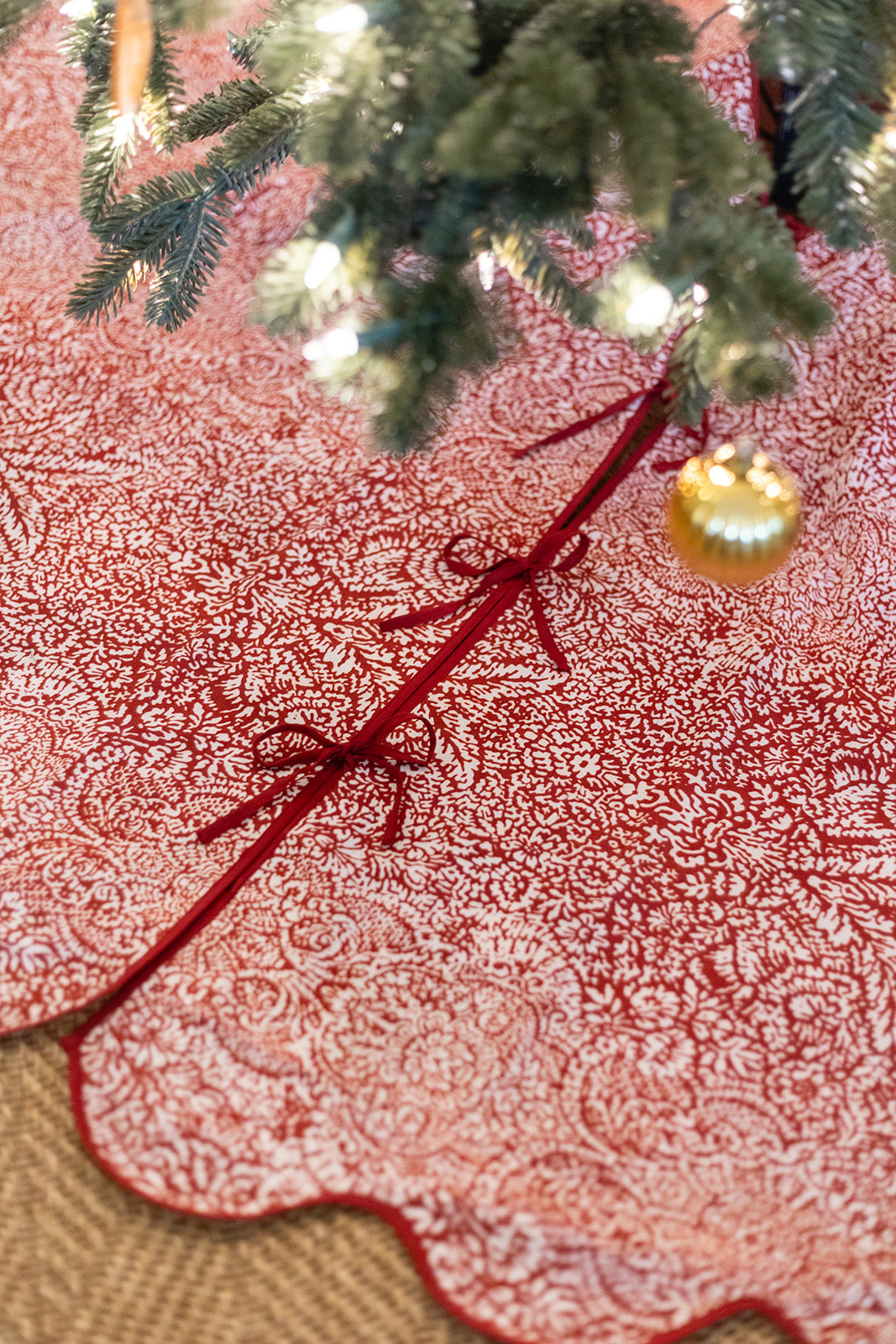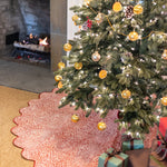 The simplest way to make your Christmas tree both chic & festive, these limited edition printed scalloped tree skirts will make your holidays brighter than ever! Printed tree skirt features coordinating piping on the scallop and seam with coordinating ties to secure the skirt.