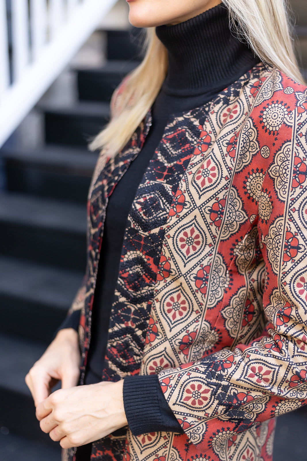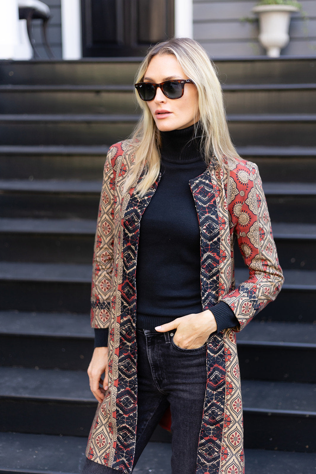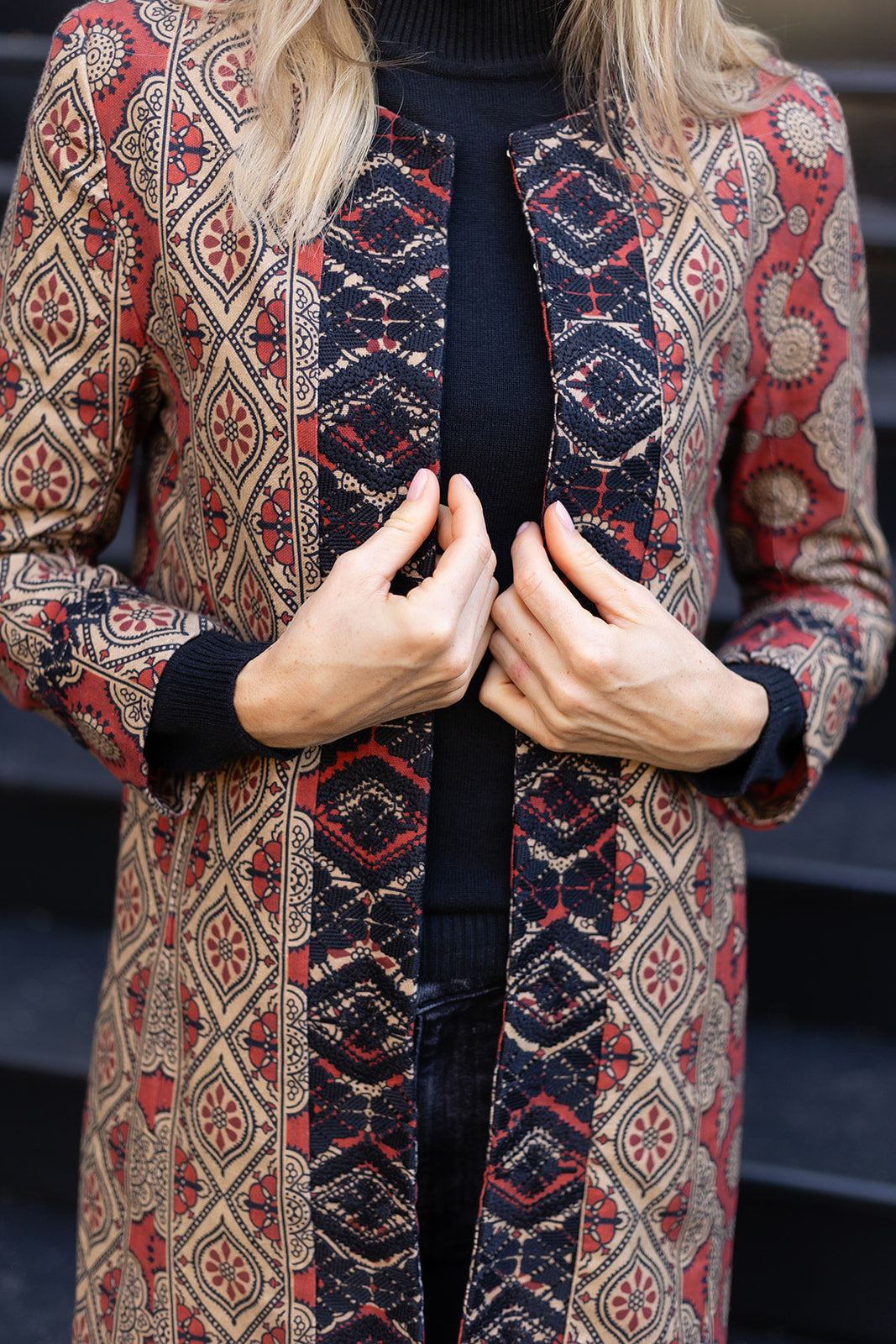 The Ali is a chic fitted open-front, mid-length jacket that we love over a knit with jeans or a Jackie Pant this fall. The Ali Jacket is made of 100% cotton canvas with geometric-patterned embroidered stitching detail along the front opening, collar, and wrist hems. Hits slightly above the hip.