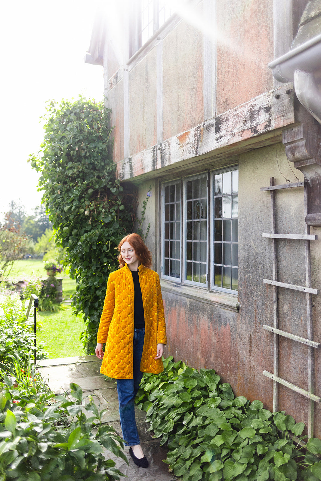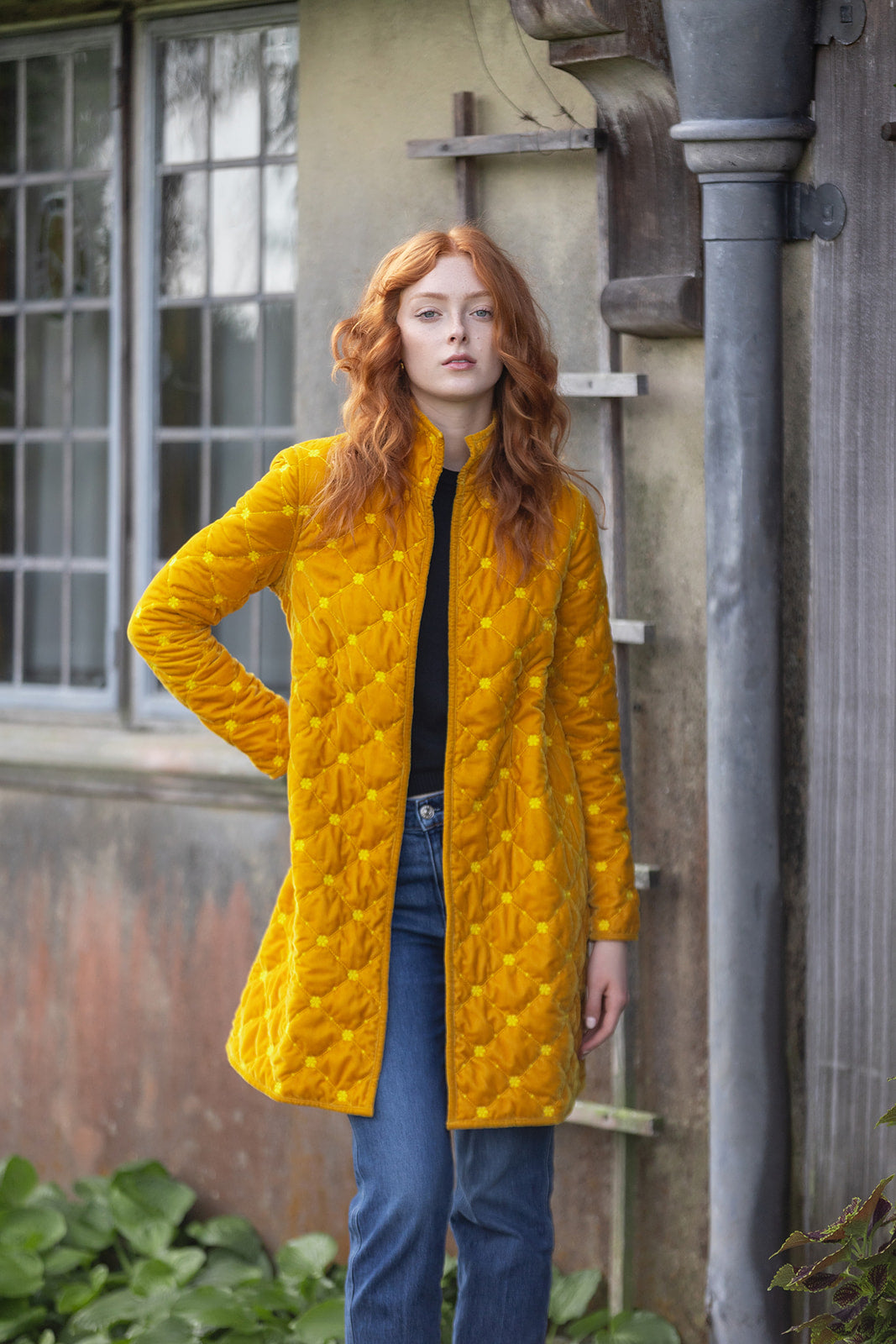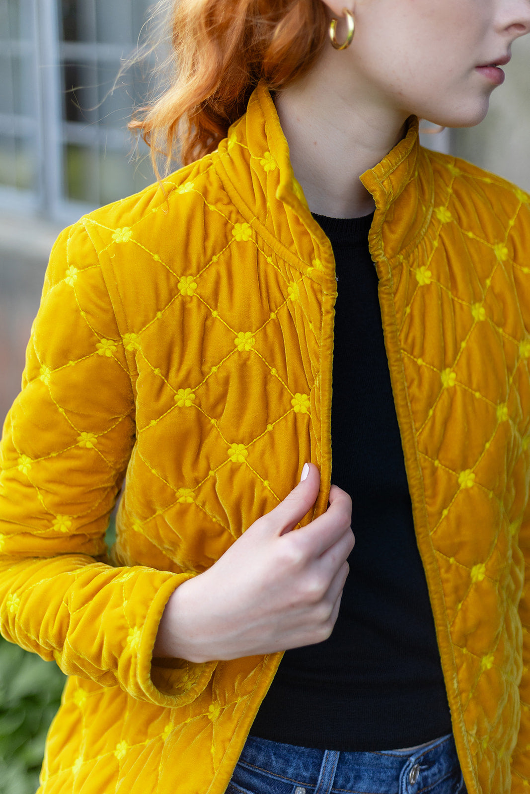 Introducing the Jackie Coat, our new mid-length quilted velvet jacket with embroidery detail. We're reaching for the Jackie this season to add some texture and funk to our fall weekend style. Features a mandarin collar, diamond pattern embroidery, and open front.