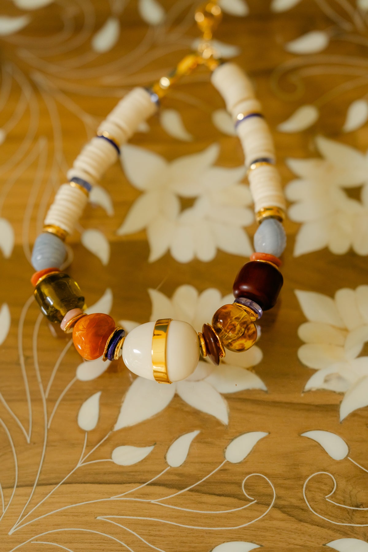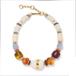 The Neptune Collar is a mixed-medium statement collar with bone, blue quartz, blue chalcedony, flame-worked glass, clay, pink opal, and gold-plated cast beads, and large cream-colored resin and gold-plated brass focal with gold-plated hook closure.