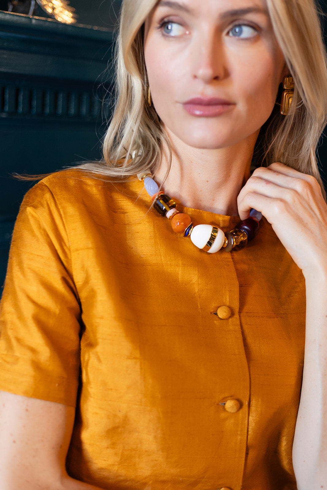 Introducing the exclusive Julia Amory x Lizzie Fortunato Neptune Collar in Blanc, a beautiful statement necklace we love styled with festive fall jewel tones either alone or layered with other necklaces.