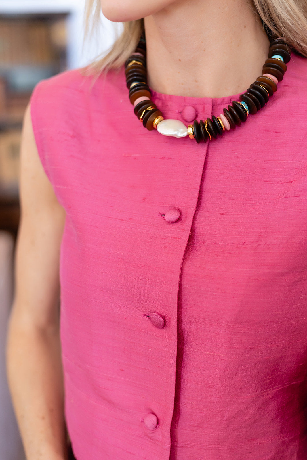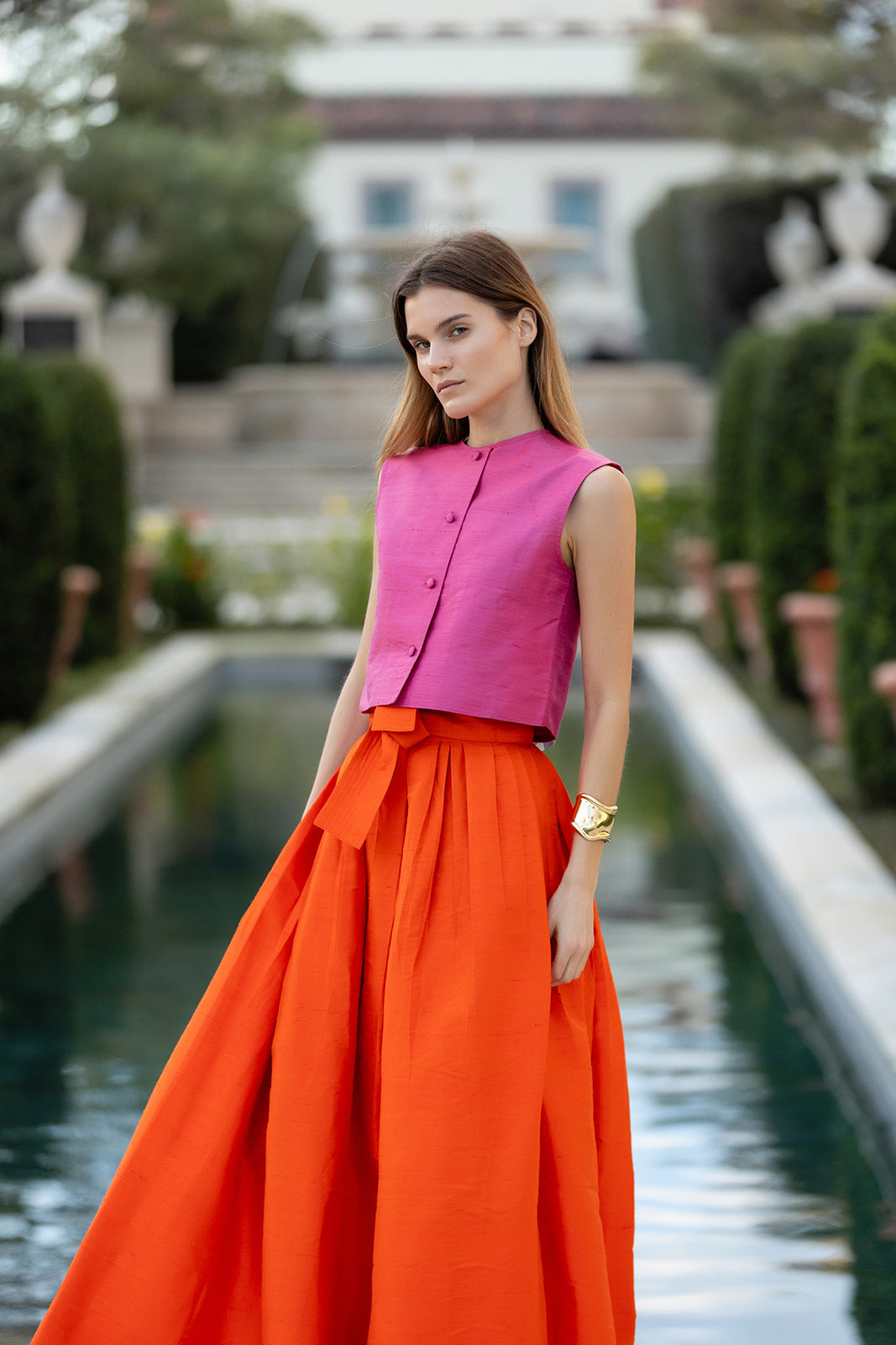 Meet the Blair Top, an ultra-flattering and versatile vest top in 100% Dupioni silk. With a button-up front and slightly cropped and boxy silhouette, she pairs perfectly with any high-waisted style (from a ball skirt to Julia Pants, to a pair of jeans).