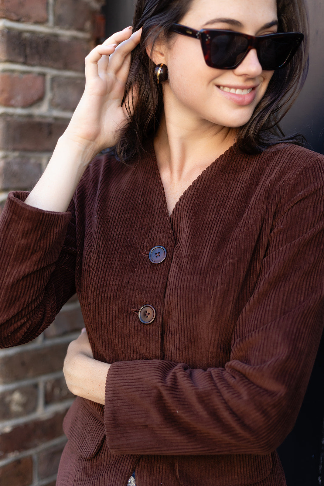 Meet the Colette Jacket, our new tailored women's jacket in wide wale corduroy. With a flattering and feminine tapered waist and v-neck, the Colette is our contemporary take on a blazer-top. Pair her with jeans and ballet flats for a daytime polished cool.