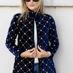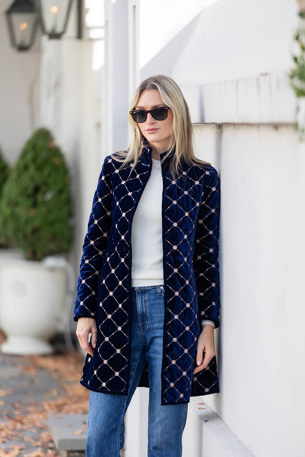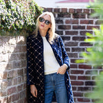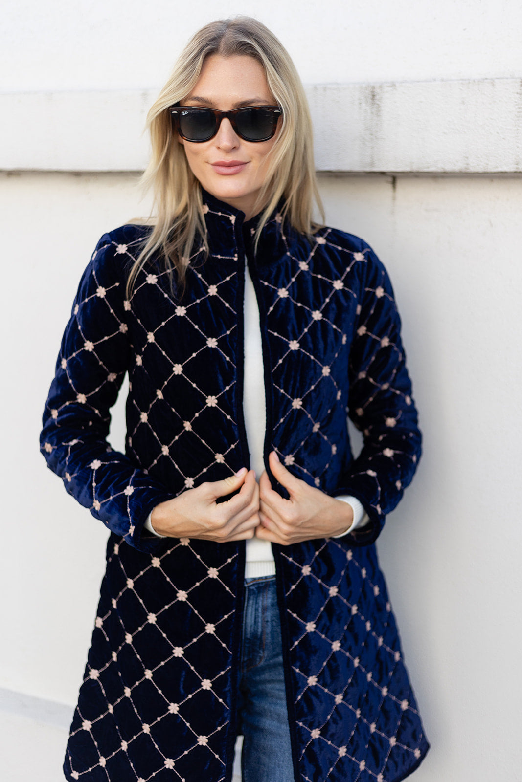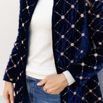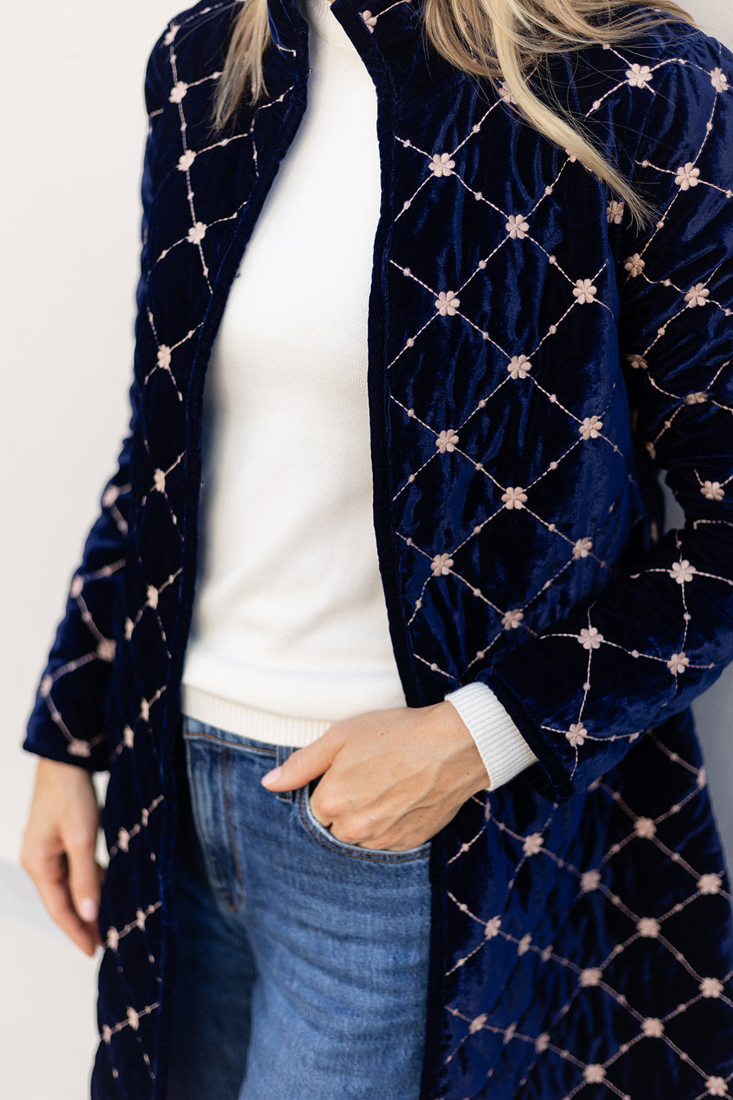 Introducing the Jackie Coat, our new mid-length quilted velvet jacket with embroidery detail. We're reaching for the Jackie this season to add some texture and funk to our fall weekend style. Features a mandarin collar, diamond pattern embroidery, and open front with two hidden hook-and-eye closures.