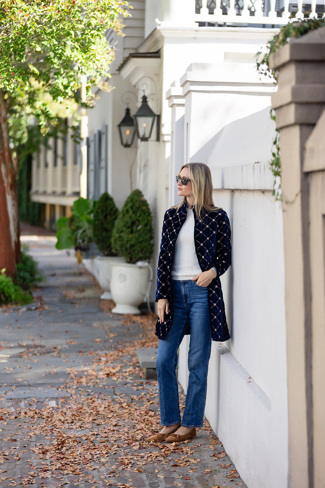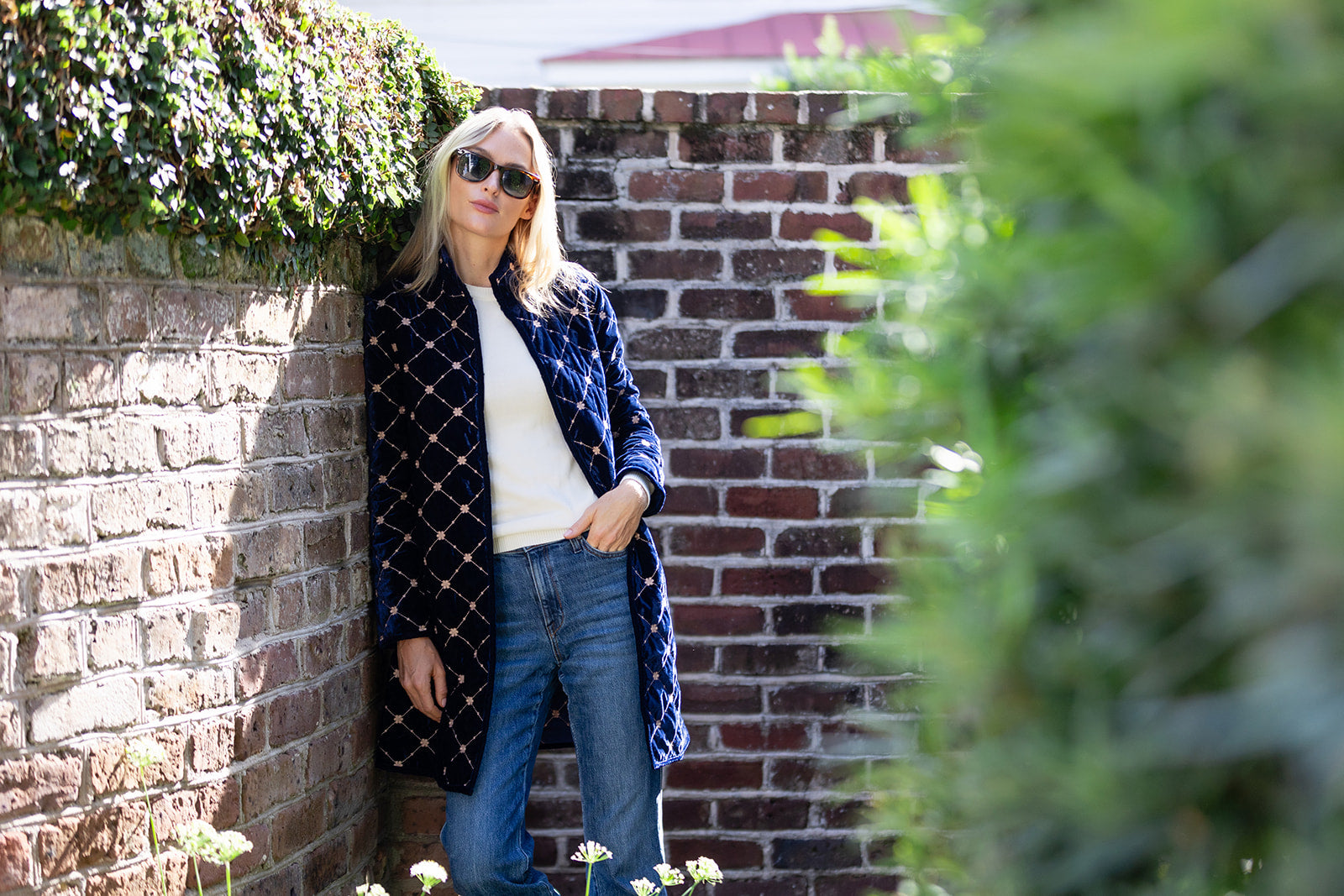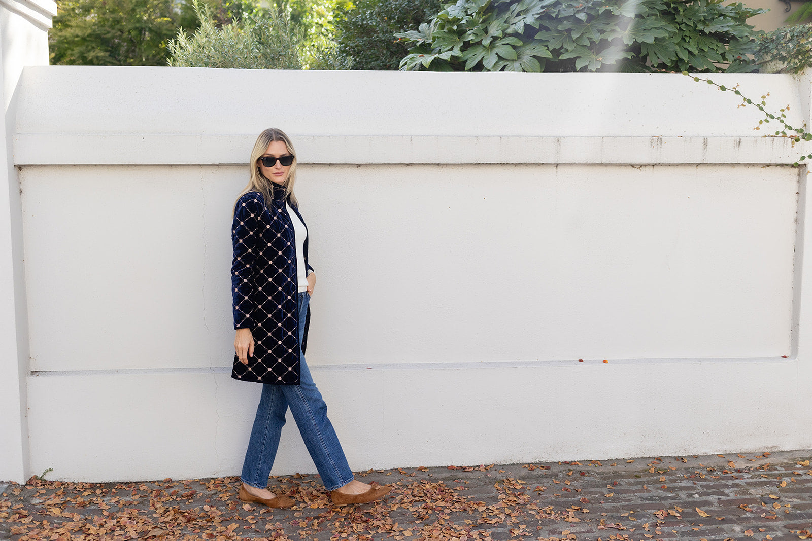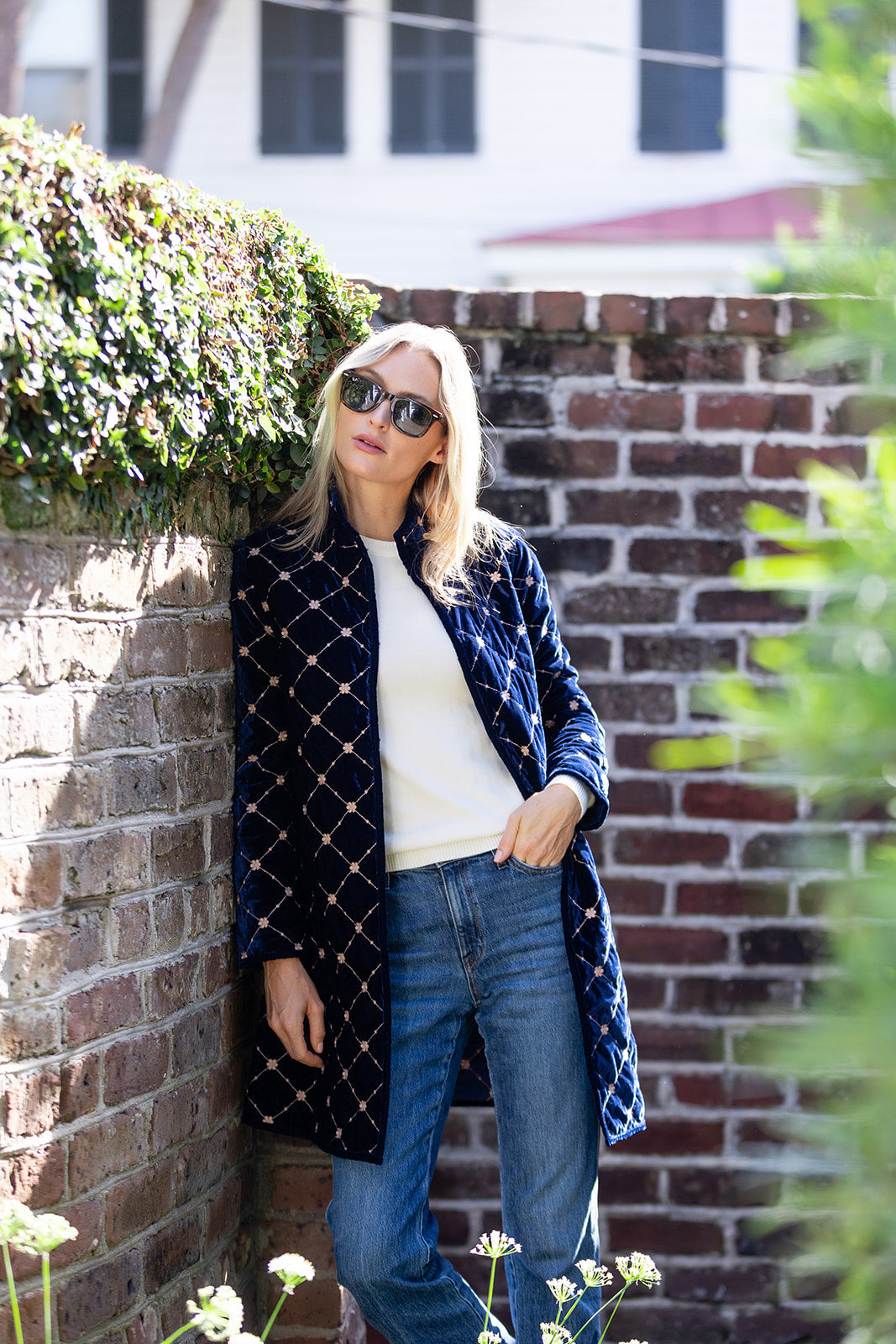 Introducing the Jackie Coat, our new mid-length quilted velvet jacket with embroidery detail. We're reaching for the Jackie this season to add some texture and funk to our fall weekend style. Features a mandarin collar, diamond pattern embroidery, and open front with two hidden hook-and-eye closures.