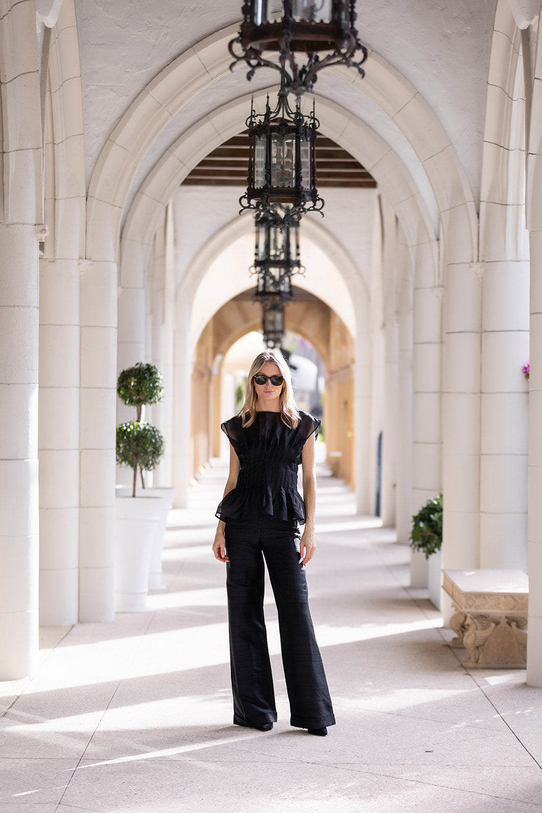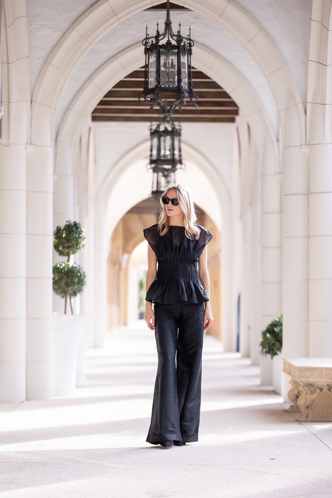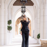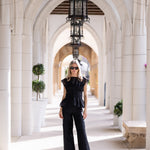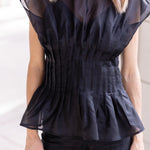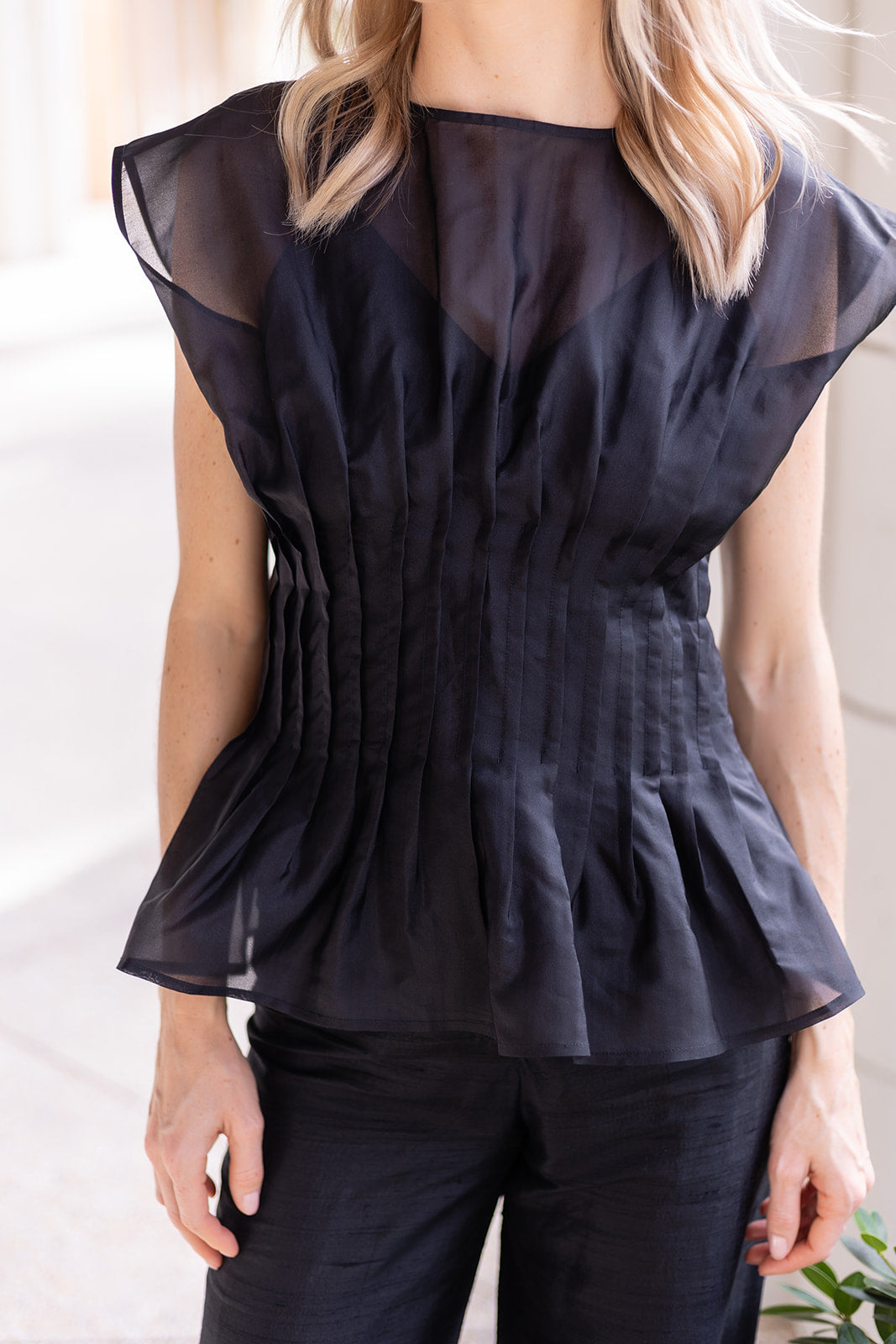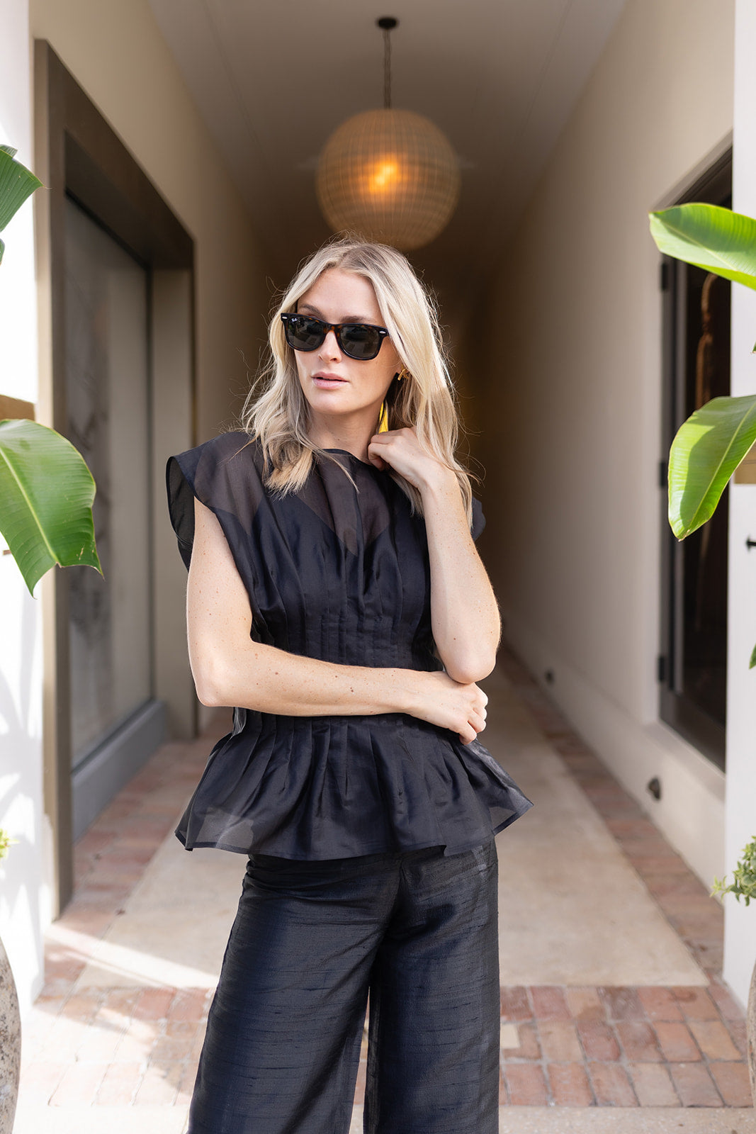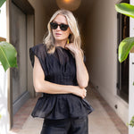 Meet the Ava Top Organza, a modern peplum silhouette crafted with delicate pintuck detailing and a sheer organza overlay. Inspired by the arresting style of 40's film star Ava Gardner, this piece blends classic elegance with contemporary edge. Designed with an ultra-flattering corseted waist, soft cap sleeves, and a subtle keyhole closure at the back, the Ava Top creates a beautifully sculpted shape. Falling just below the waist, it pairs effortlessly with the Julia Pants for a polished evening look or with denim for a chic, city-ready night out.