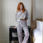 The women's pajama set is a deliciously cozy yet chic PJ set that will take you from your bed to the breakfast table and back. Made with a super-soft 100% cambric cotton fabric and a slightly more generous fit for extra comfort. The style features a collared button-up top with long sleeves, and drawstring pants. Both the top and pants feature coordinating piping.