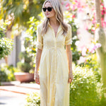 - Dress features concealed button front, figure flattering empire waist with a subtle A-line cut ankle length skirt, and concealed pockets.
