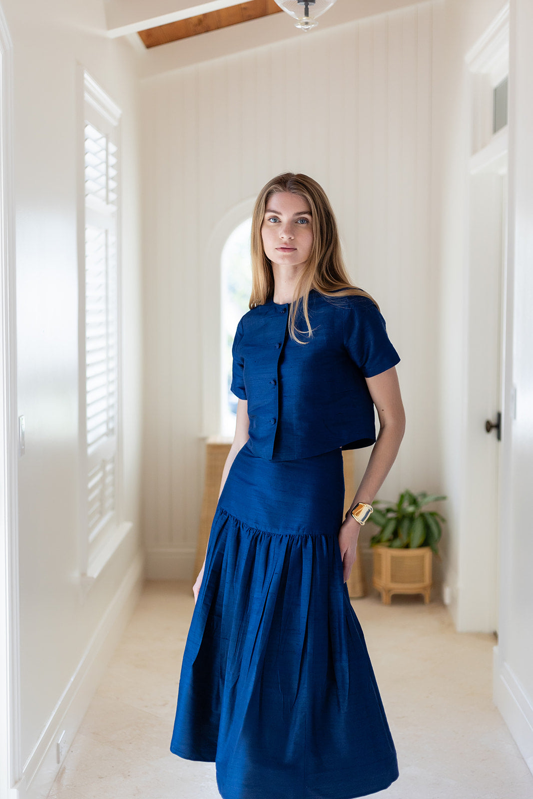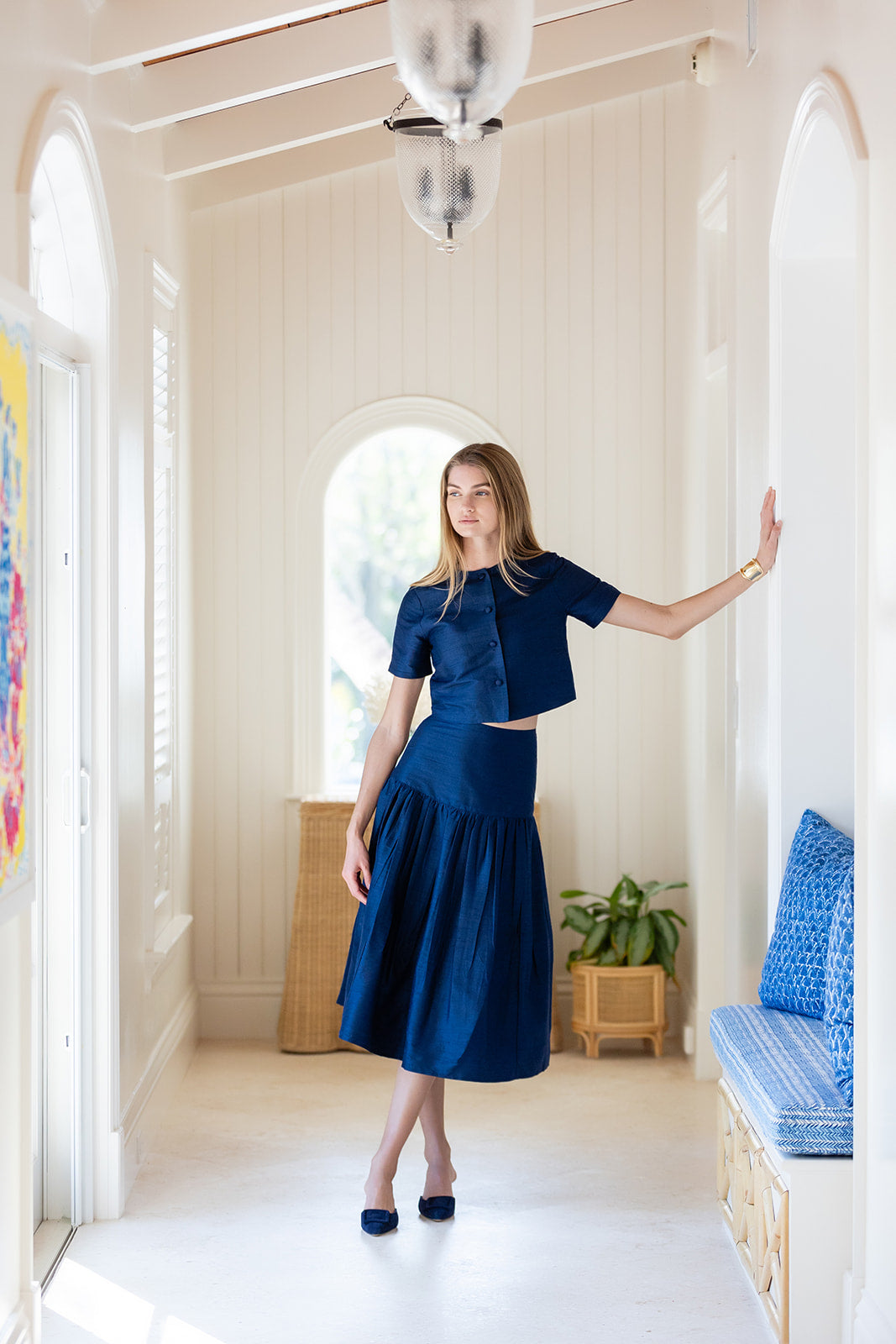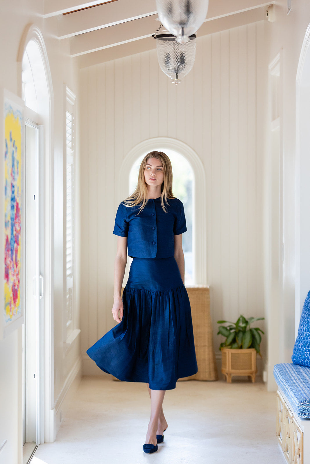 Meet the Circle Skirt, a drop-waist midi skirt, now in silk Dupioni. High-waisted to show off your waist, she's super flattering, a little fun, and can be dressed up or down easily. We love her with the matching Circle Top in Dupioni for an effortless set, or a Tippi and sandals for a more casual ensemble. Features concealed zipper closure in back.
