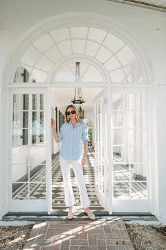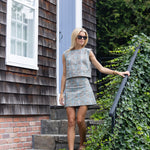 With a slightly boxy shape and lightly padded capped sleeves, the Slim is the perfectly chic top to pair with the coordinating Gidget Mini Skirt for a set, or jeans (white or blue).