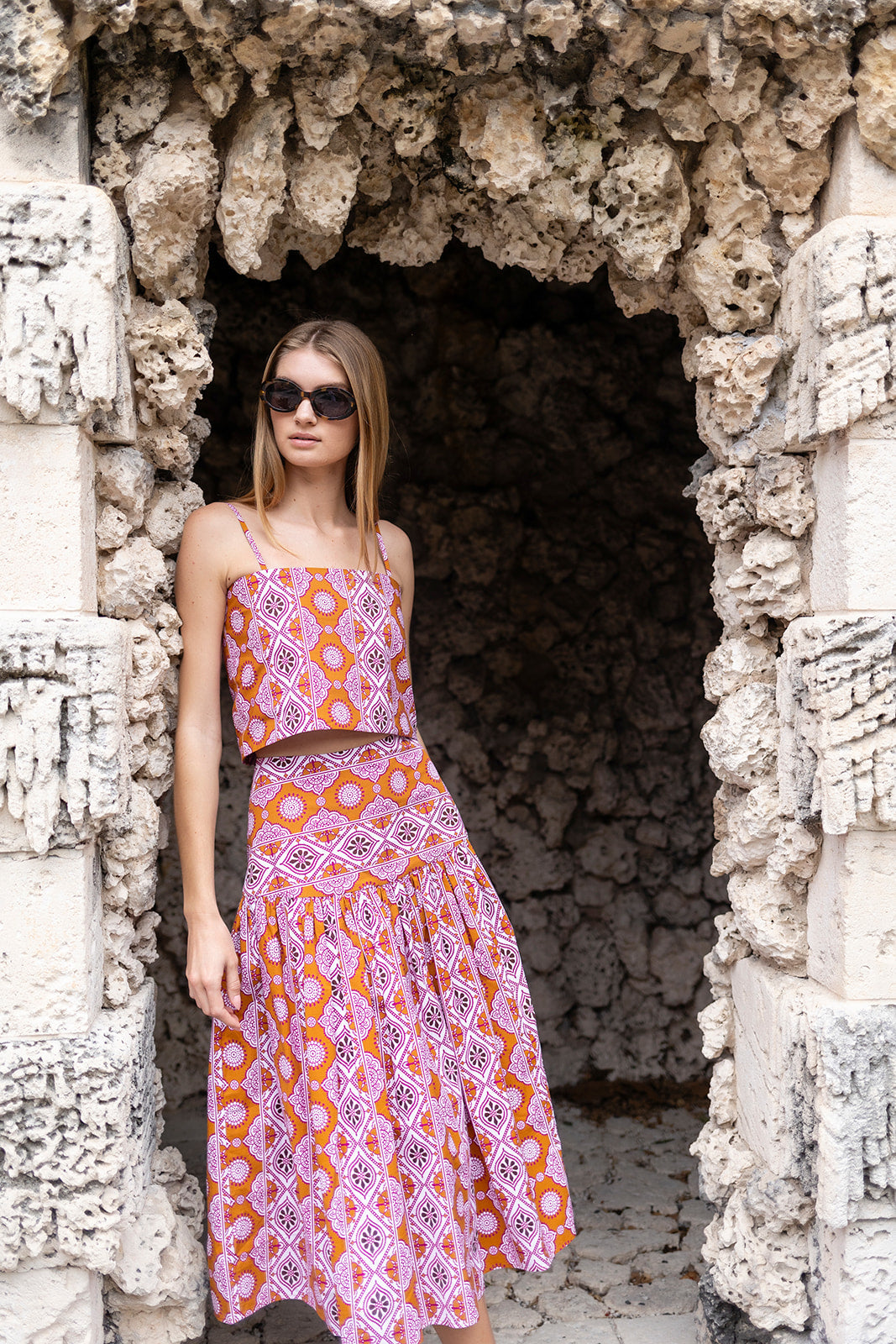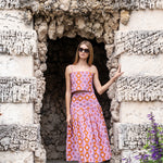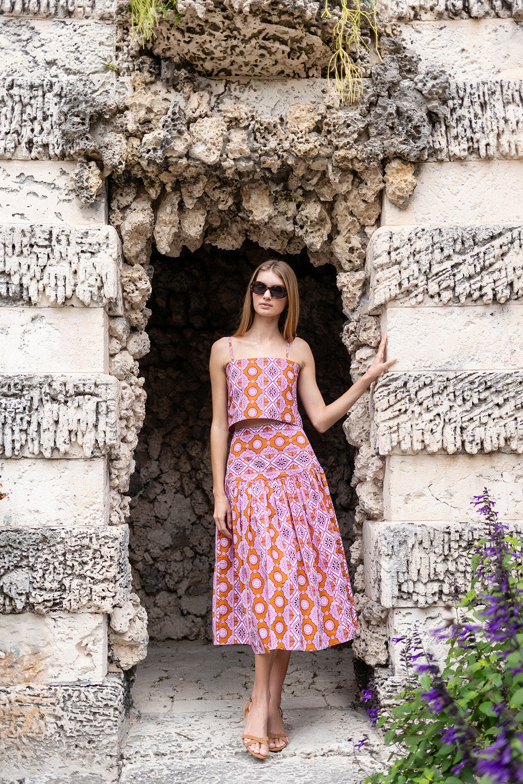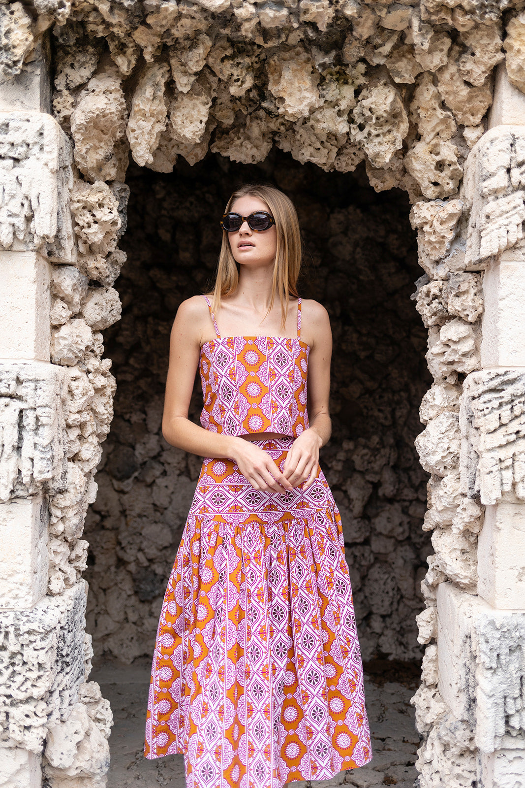 Meet the Circle Top in printed cotton poplin, a boxy, cropped, spaghetti strap top that compliments the matching Circle Skirt perfectly (but we also love with high-waisted jean). Paired with the Circle Skirt she's designed to drape loosely but be cropped enough to show off your waist. Features button closure down the back of the top.