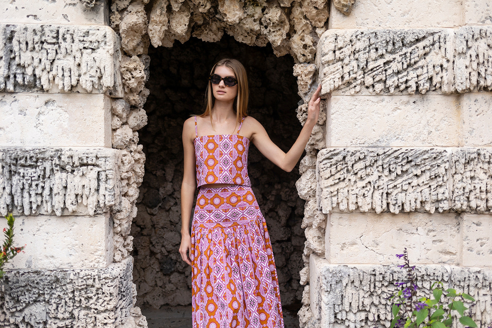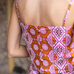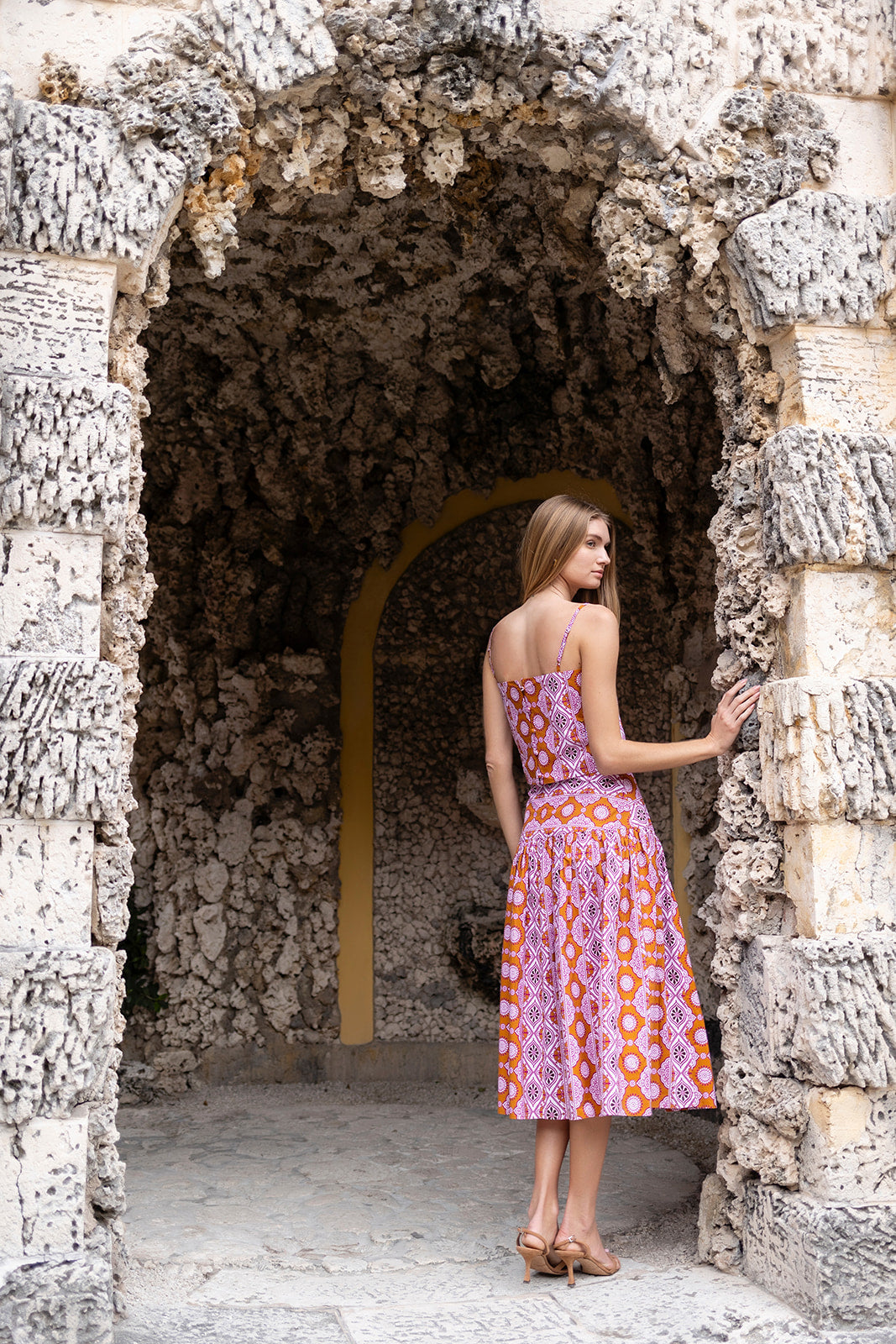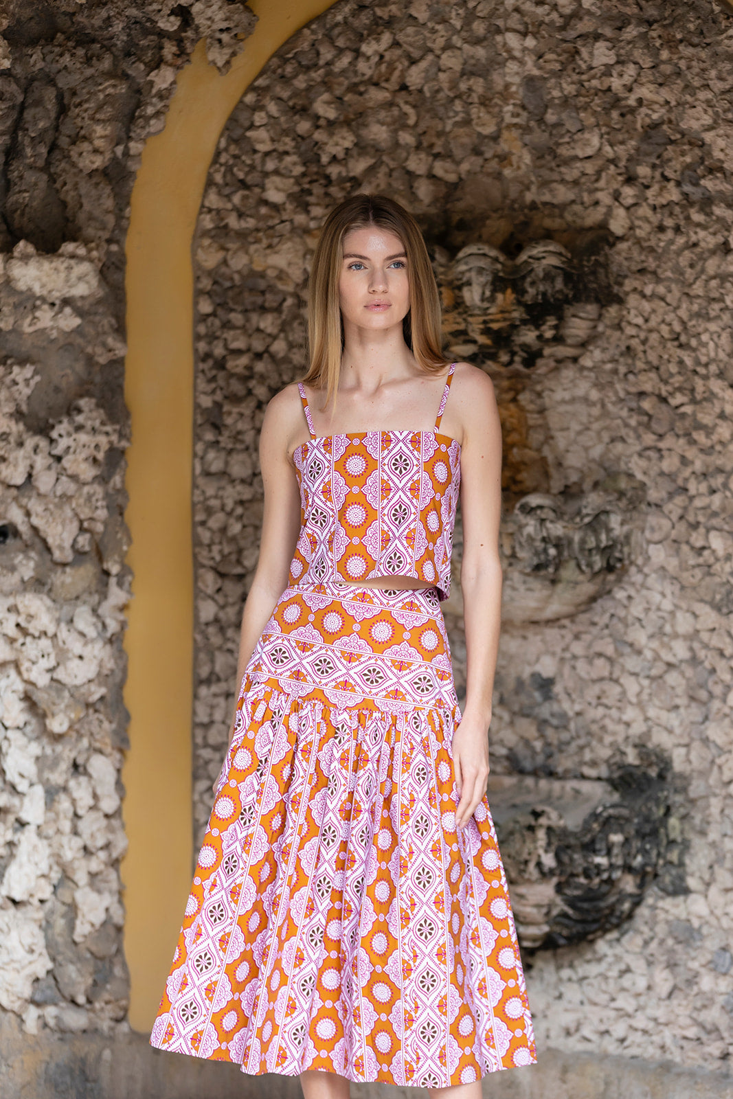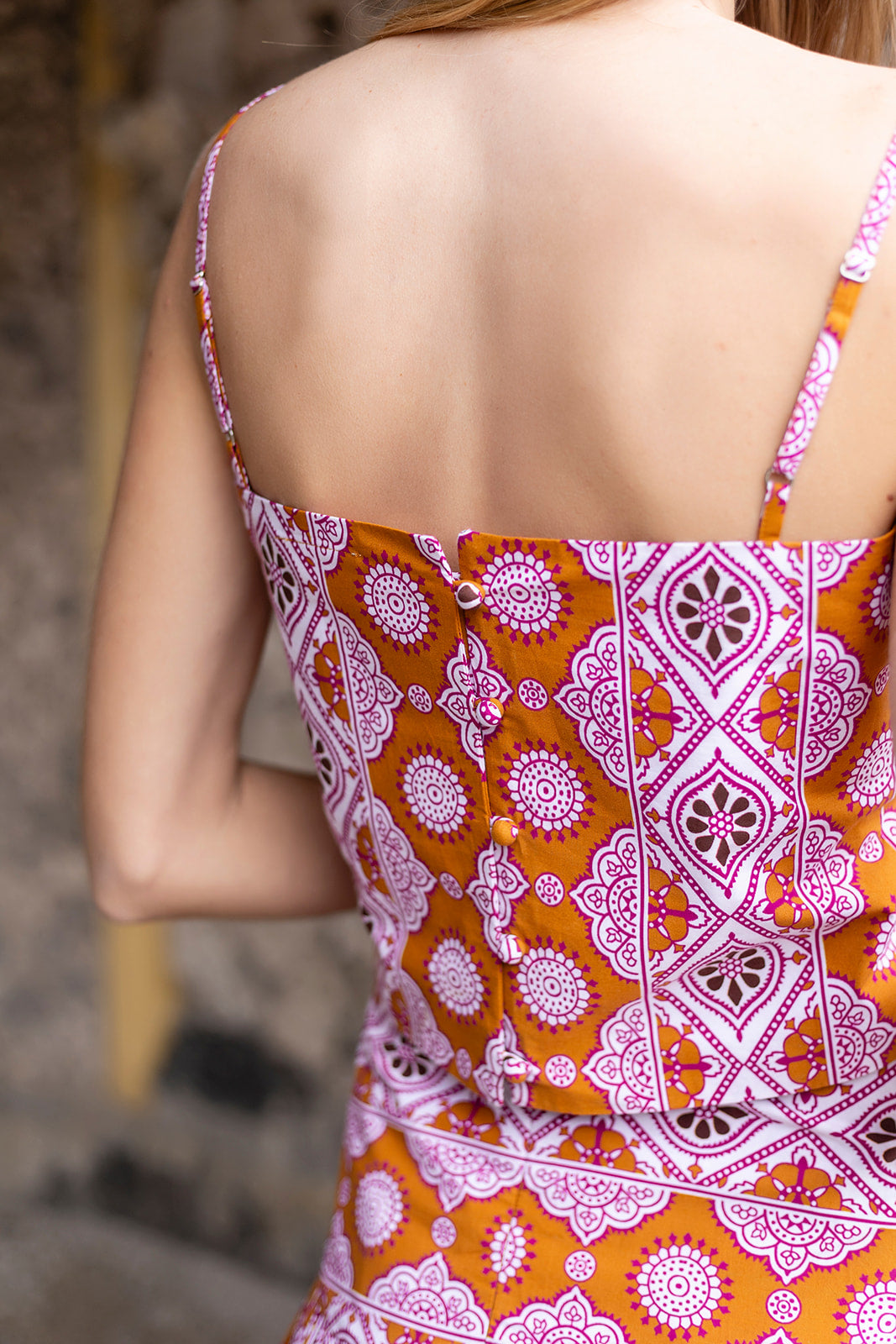 Meet the Circle Top in printed cotton poplin, a boxy, cropped, spaghetti strap top that compliments the matching Circle Skirt perfectly (but we also love with high-waisted jean). Paired with the Circle Skirt she's designed to drape loosely but be cropped enough to show off your waist. Features button closure down the back of the top.