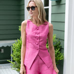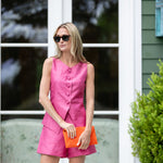 Introducing the Tess Vest, our new vest top inspired by classic menswear with a modern and distinctly feminine twist. Made of 100% Dupioni Silk, she features a fitted and slightly longer silhouette in the front than back, a v-neck, and silk-covered button front. The Tess Vest pairs perfectly with the Julia Pant for a fun and dare we say *slightly sexy* party outfit.