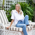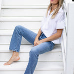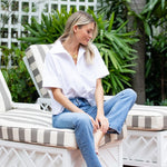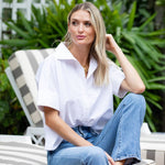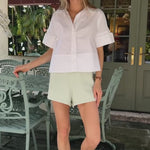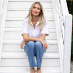 Meet the Antibes Shirt, our elevated short-sleeved button-down shirt with a french cuff. The Antibes has a boxy shape designed for a relaxed fit, and the figure-flattering broad collar and cuff draws the eye up from the waist. A classically tailored & easy staple, she is slightly cropped to pair perfectly with a high-waisted bottom (think cropped jeans or a tailored skirt).