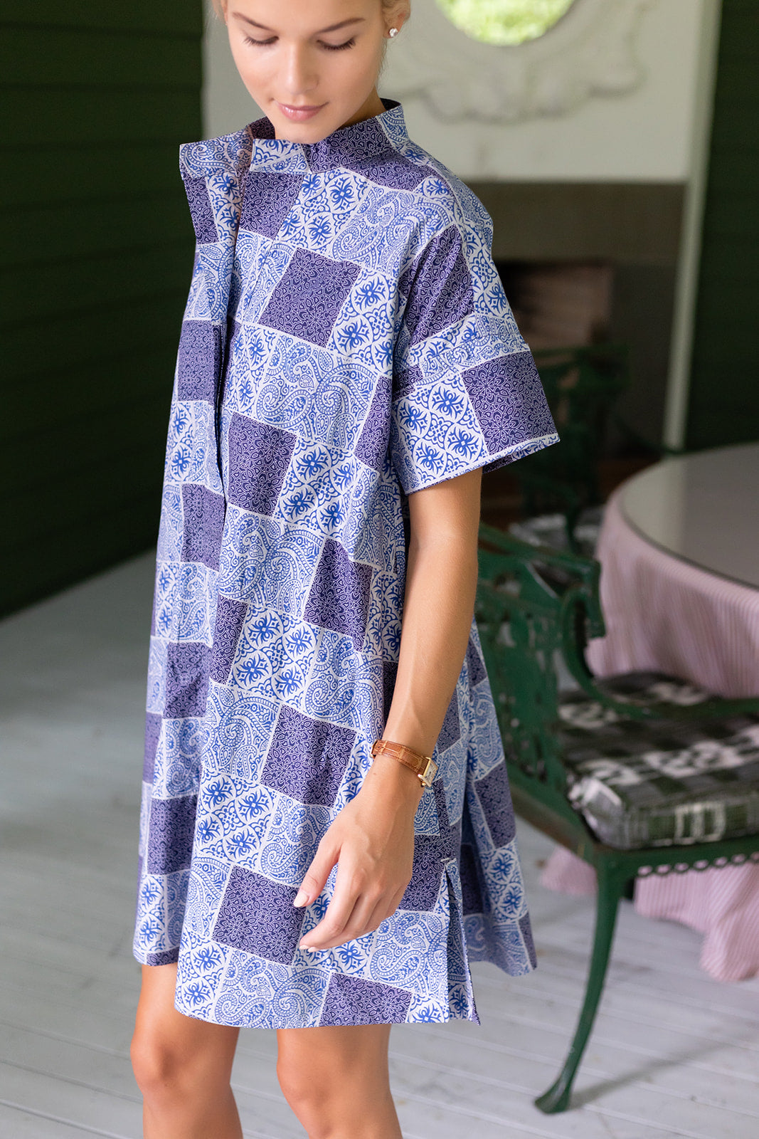 Meet the Twiggy Dress, a happy and chic swing dress inspired by Twiggy's iconic '60s style. A mod take on a shirt dress, the Twiggy has a cuffed short sleeve and hem with a mock color, button down front, pockets and a slightly shorter length in the front than back.