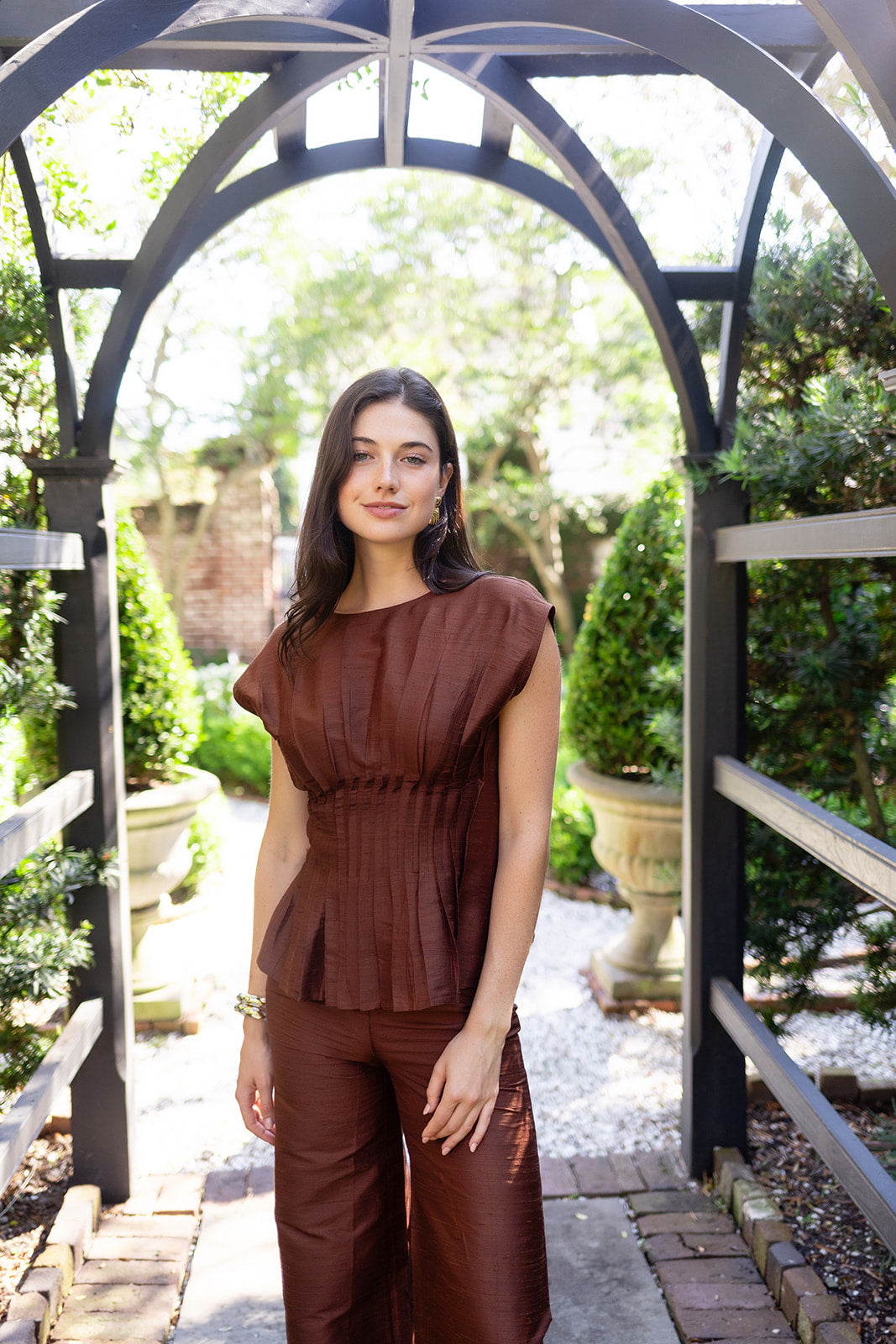 Meet the Ava Top, an elegant and modern peplum pintuck top in Dupioni silk inspired by the arresting style of 40's film star Ava Gardner. The top features an ultra-flattering corseted waist, cap sleeve, and keyhole neck closure in the back. Hitting below the waist, she pairs perfectly with the Julia Pants for an evening ensemble or denim for a cooler, night-out-in-the-city look.