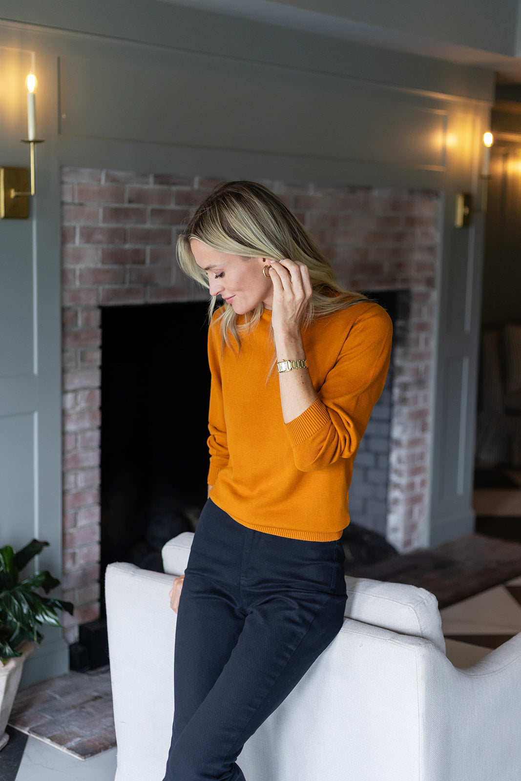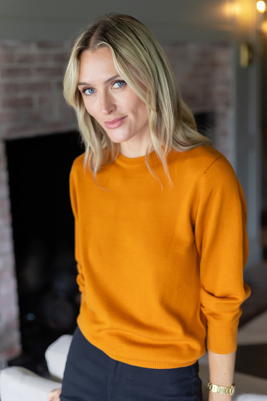 Meet the Bacall Sweater, our long sleeve knit that's dressier than a long-sleeve t-shirt but without the bulk of a heavier sweater. She's comfortably soft and fitted enough to dress up and tuck into high-waisted styles. Hits at the hip.