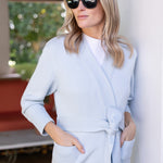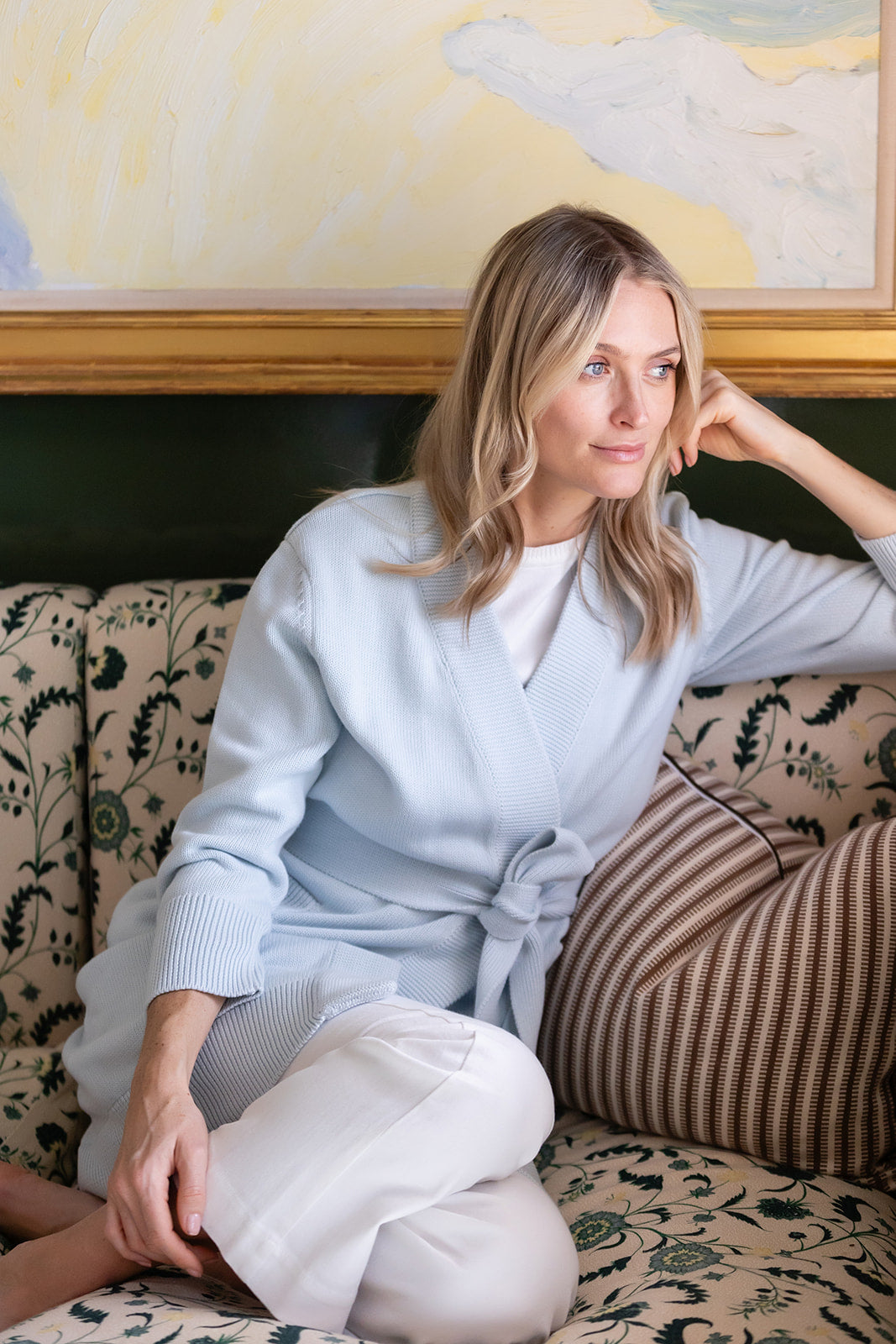 Meet the Falmouth Wrap Sweater, the newest addition to the Falmouth knit family. Inspired by the coziest Nancy Meyers movies (our thoughts are it's 'It's Complicated' for West Coasters and 'Something's Gotta Give' for East), she is your new elevated and effortless go-to. Made of 100% Cotton knit and featuring a coordinating belt. We love her paired with Bell Pants or jeans.