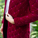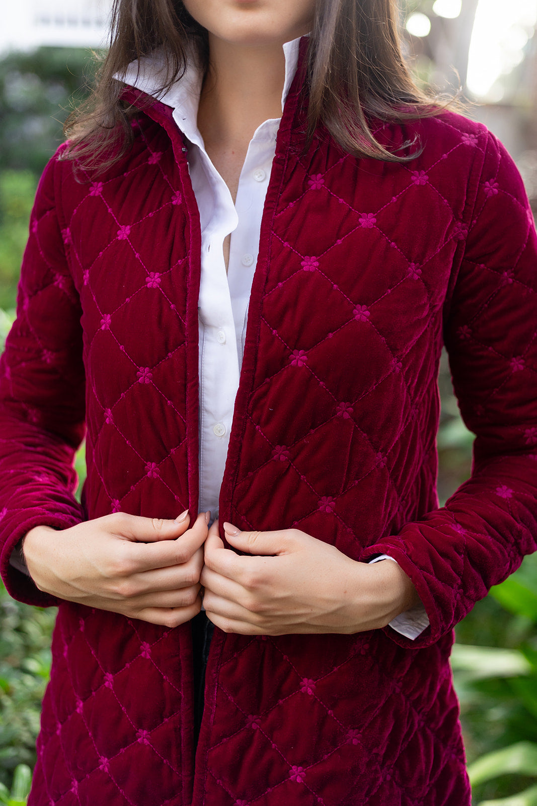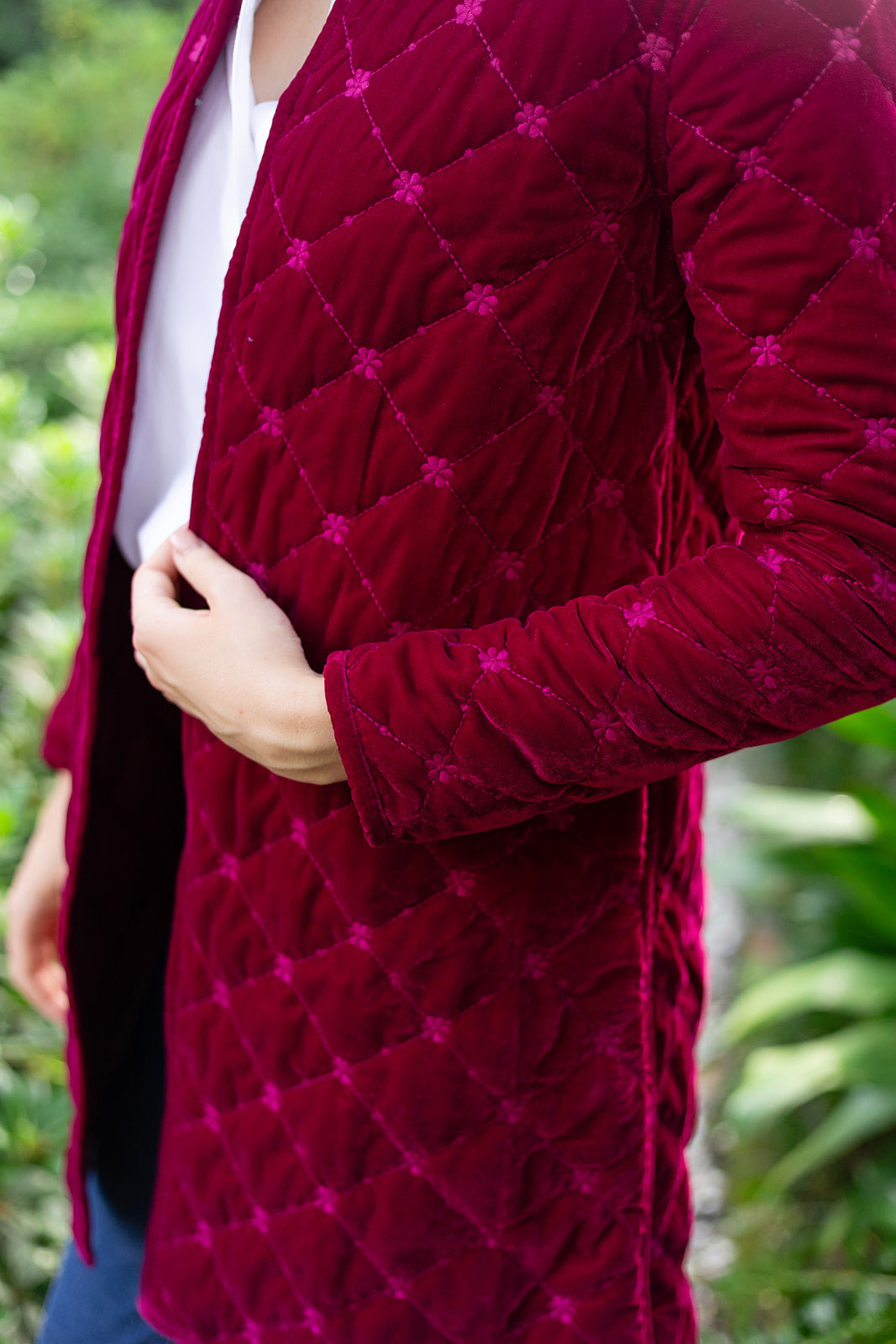Introducing the Jackie Coat, our new mid-length quilted velvet jacket with embroidery detail. We're reaching for the Jackie this season to add some texture and funk to our fall weekend style. Features a mandarin collar, diamond pattern embroidery, and open front with two hidden hook-and-eye closures.