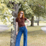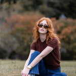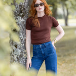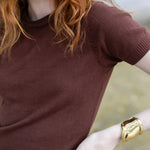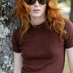 Meet the Lee Sweater, our new short sleeve knit and basically our extra pulled-together version of a t-shirt. She's comfortably soft and fitted enough to dress up and tuck into high-waisted styles. Hits at the hip. Made of cotton viscose blend fabric.