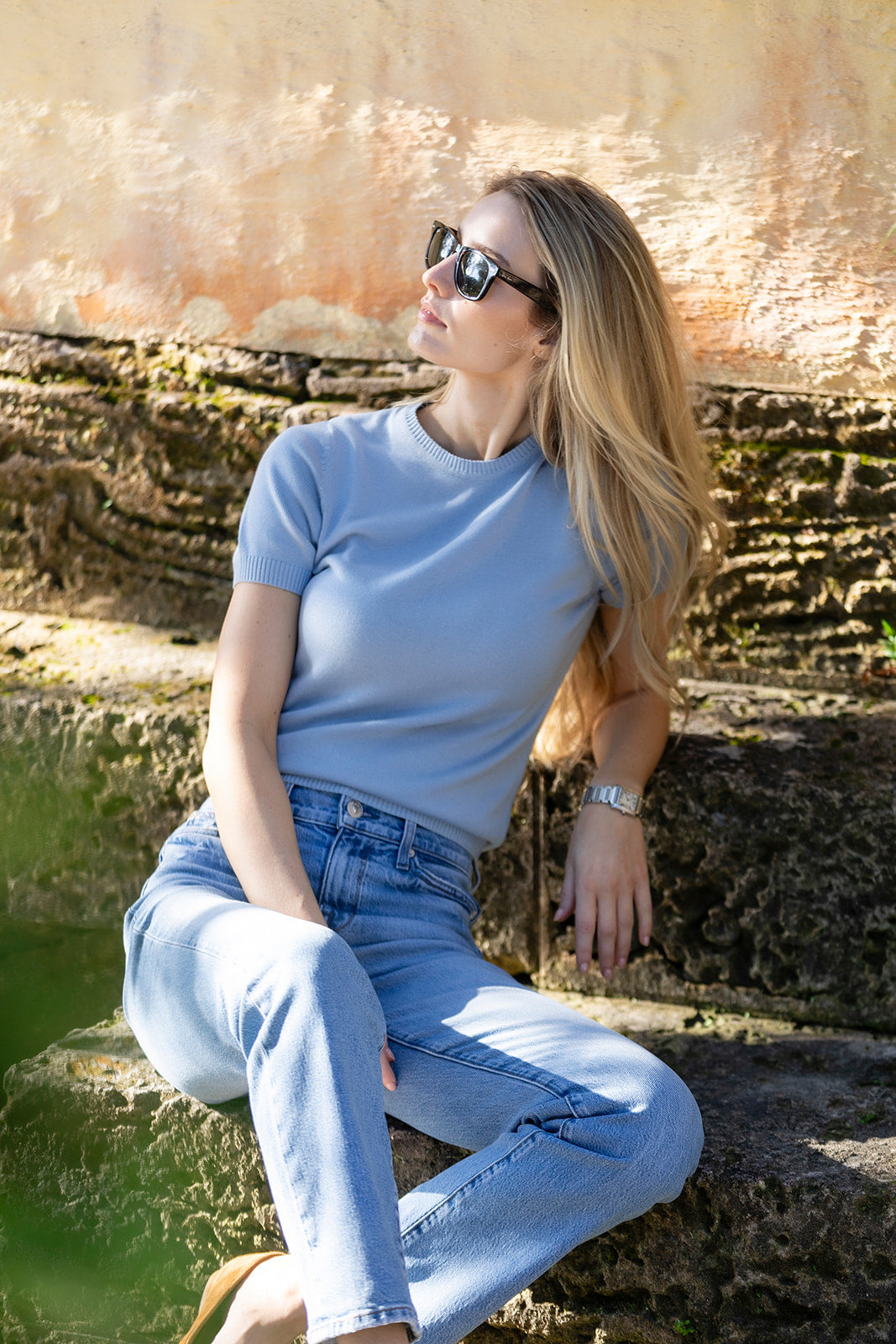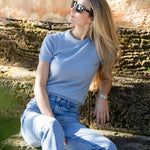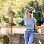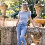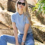 Meet the Lee Sweater, our new short sleeve knit and basically our extra pulled-together version of a t-shirt. She's comfortably soft and fitted enough to dress up and tuck into high-waisted styles. Hits at the hip. Made of cotton viscose blend fabric.