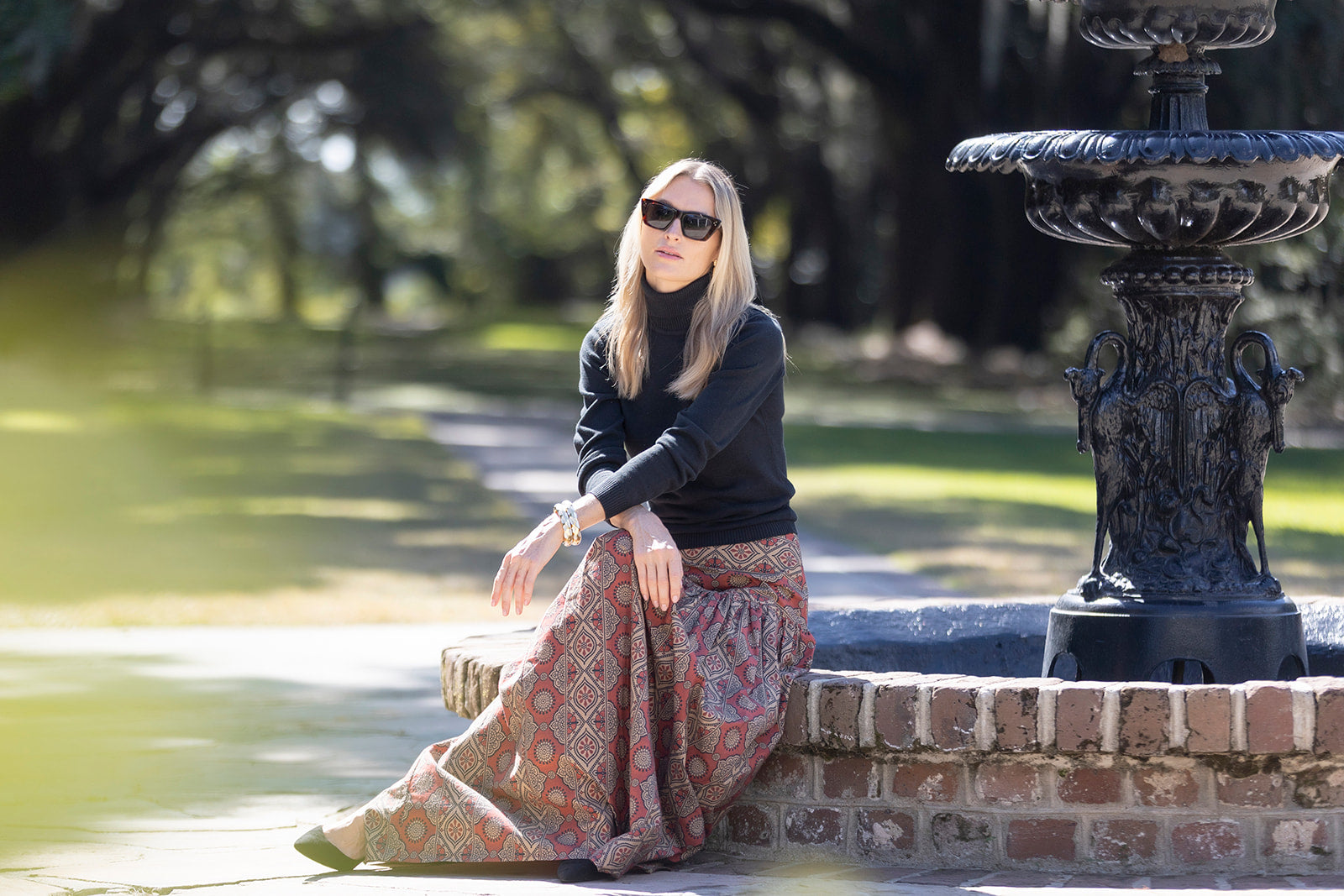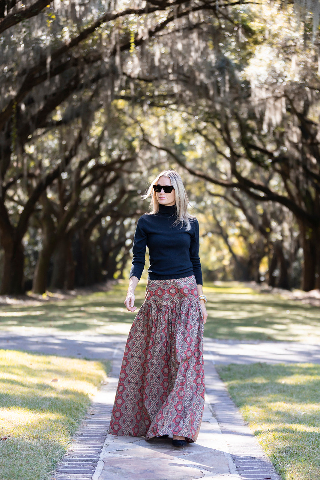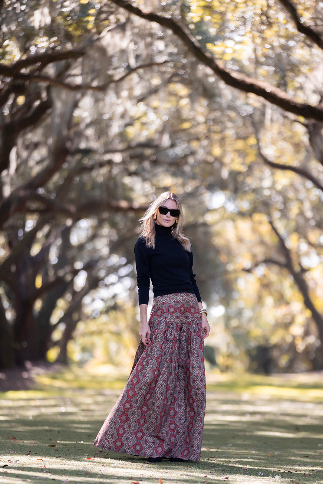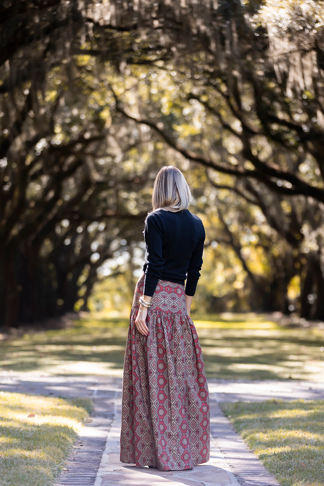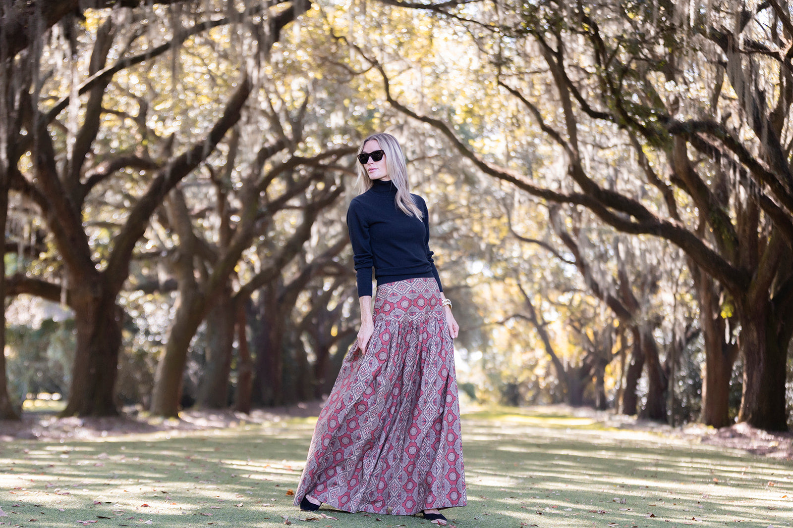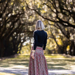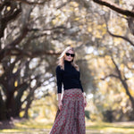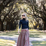 Meet the Luna Skirt, a drop-waist full length skirt in printed cotton poplin made with fall dinner parties and holiday festivities in mind. High-waisted to show off your waist, she's both flattering and a little fun. We love her paired with a thin knit like the Diane turtleneck for an effortlessly chic ensemble. Features concealed zipper closure in back.