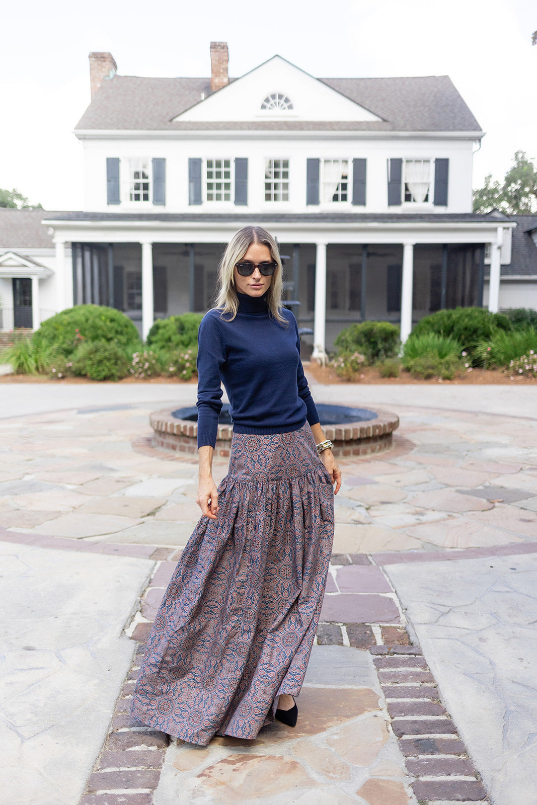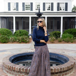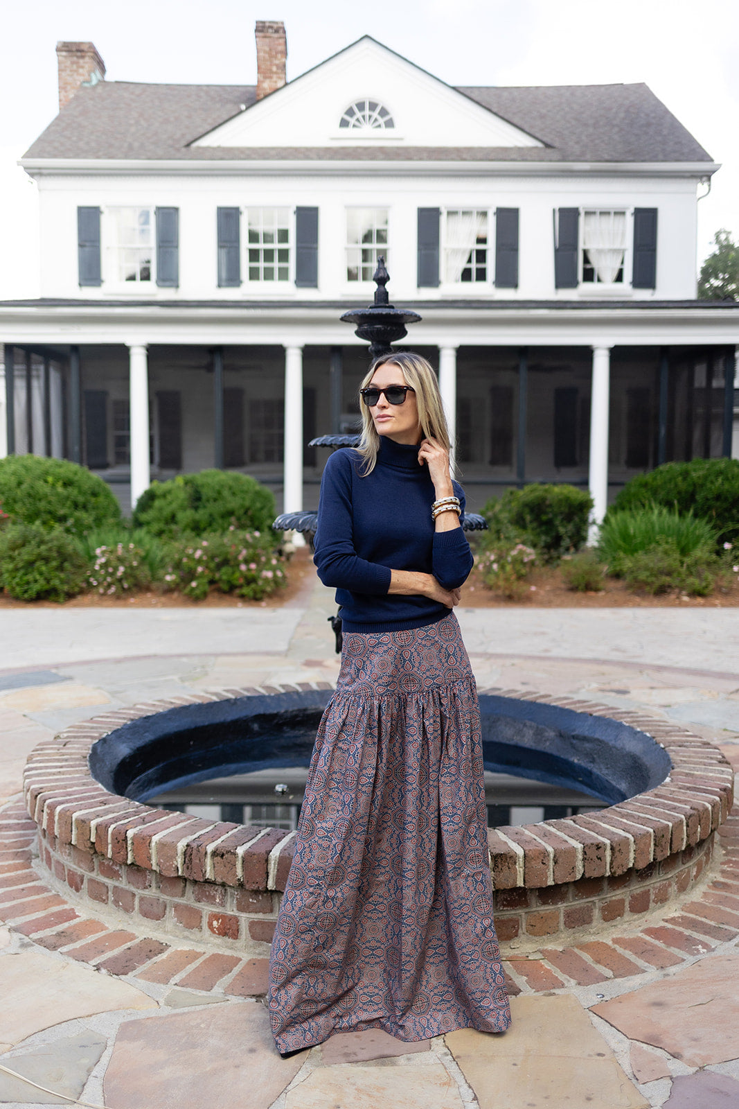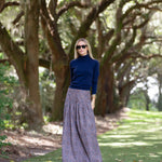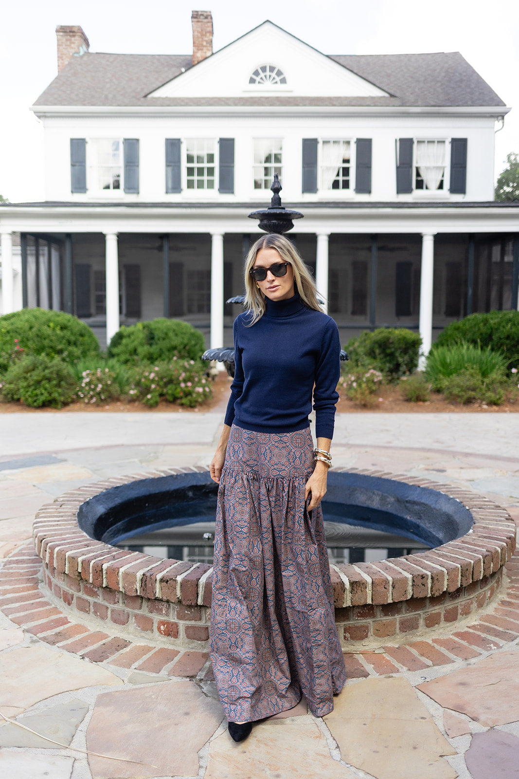 Meet the Luna Skirt, a drop-waist full length skirt in printed cotton poplin made with fall dinner parties and holiday festivities in mind. High-waisted to show off your waist, she's both flattering and a little fun. We love her paired with a thin knit like the Diane turtleneck for an effortlessly chic ensemble. Features concealed zipper closure in back.