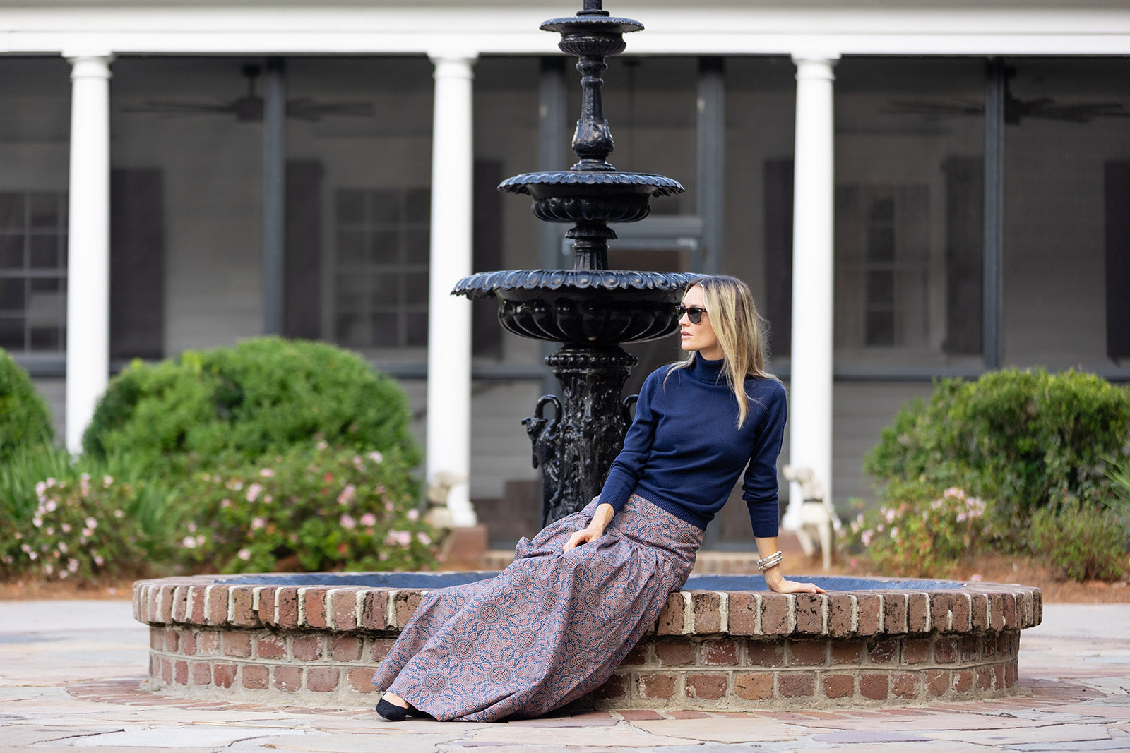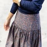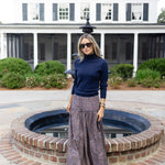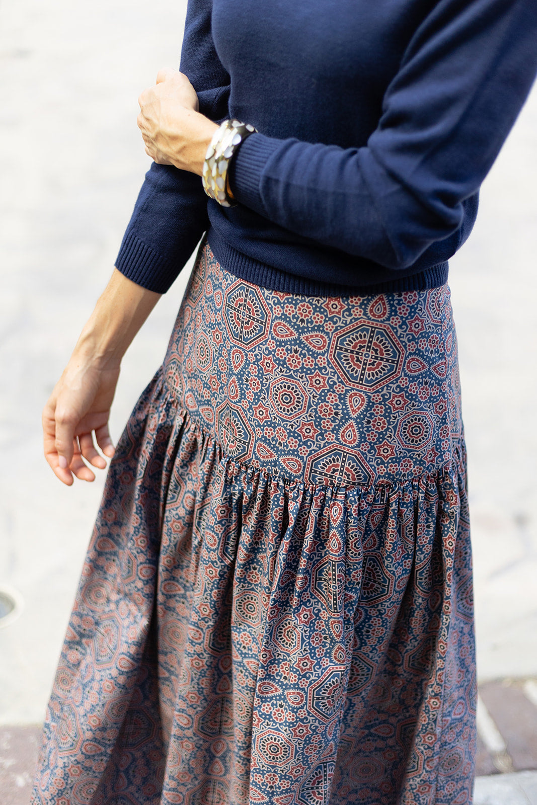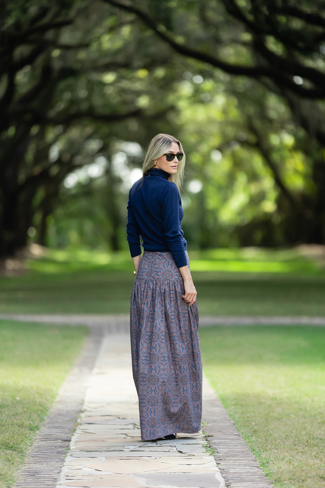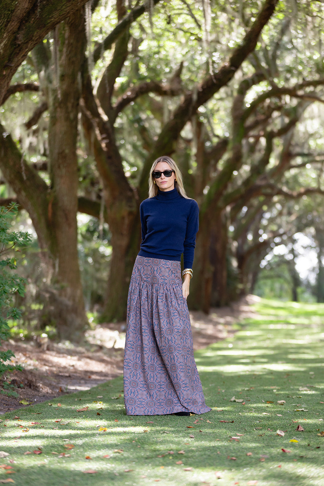 Meet the Luna Skirt, a drop-waist full length skirt in printed cotton poplin made with fall dinner parties and holiday festivities in mind. High-waisted to show off your waist, she's both flattering and a little fun. We love her paired with a thin knit like the Diane turtleneck for an effortlessly chic ensemble. Features concealed zipper closure in back.