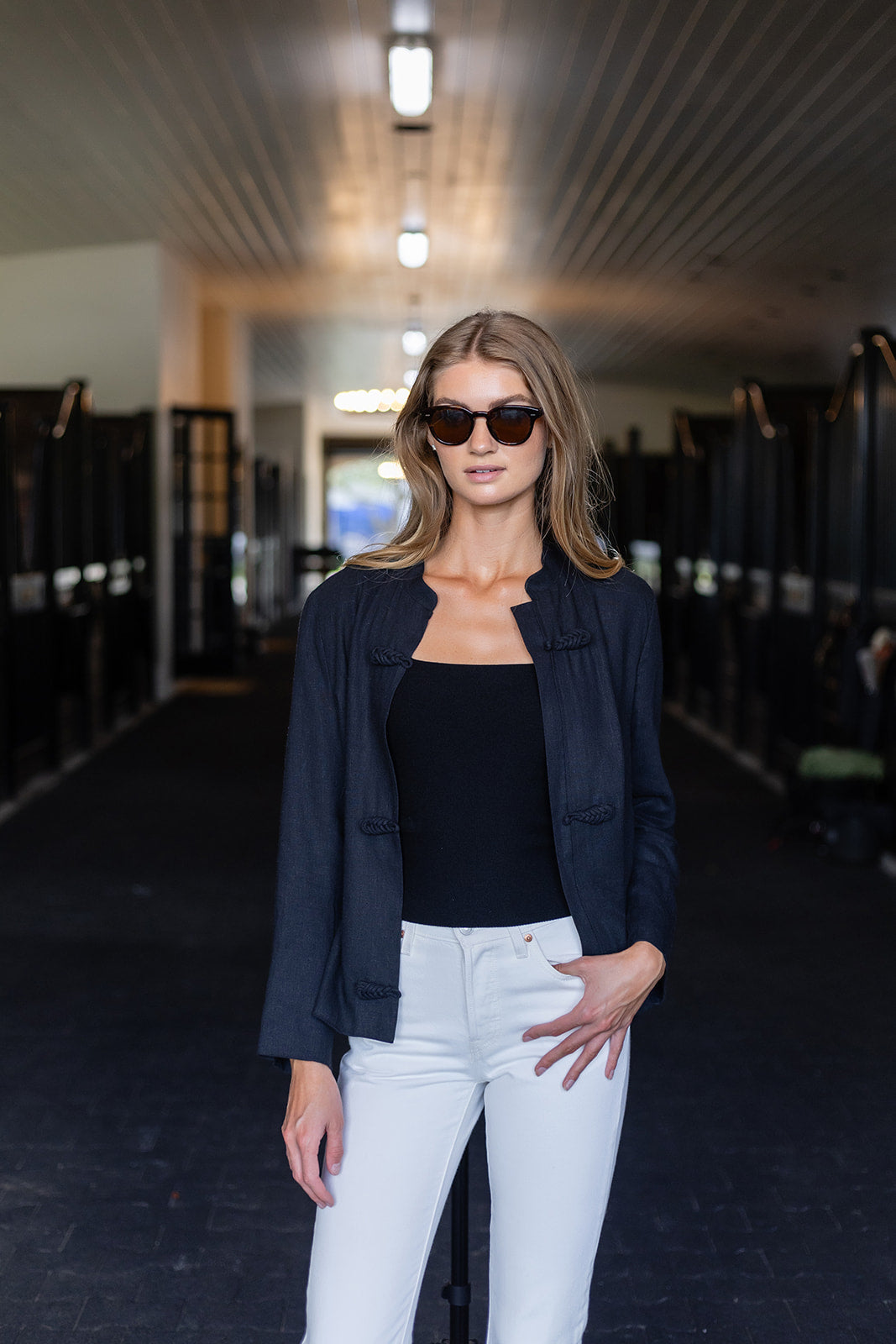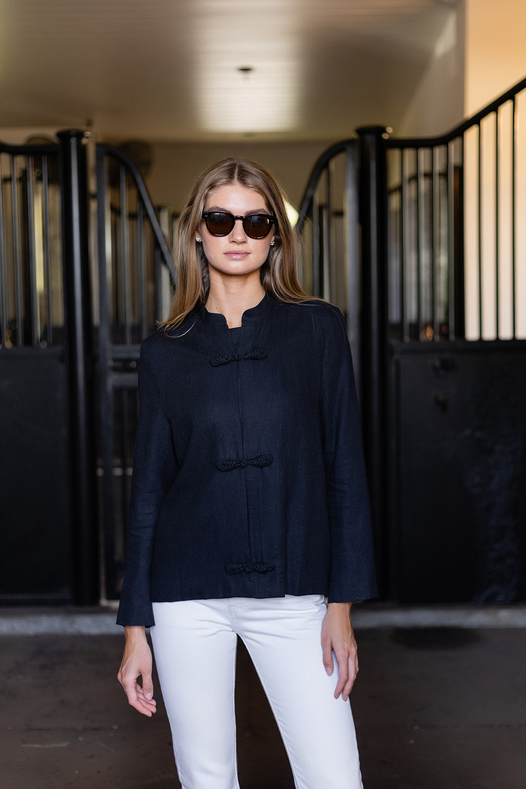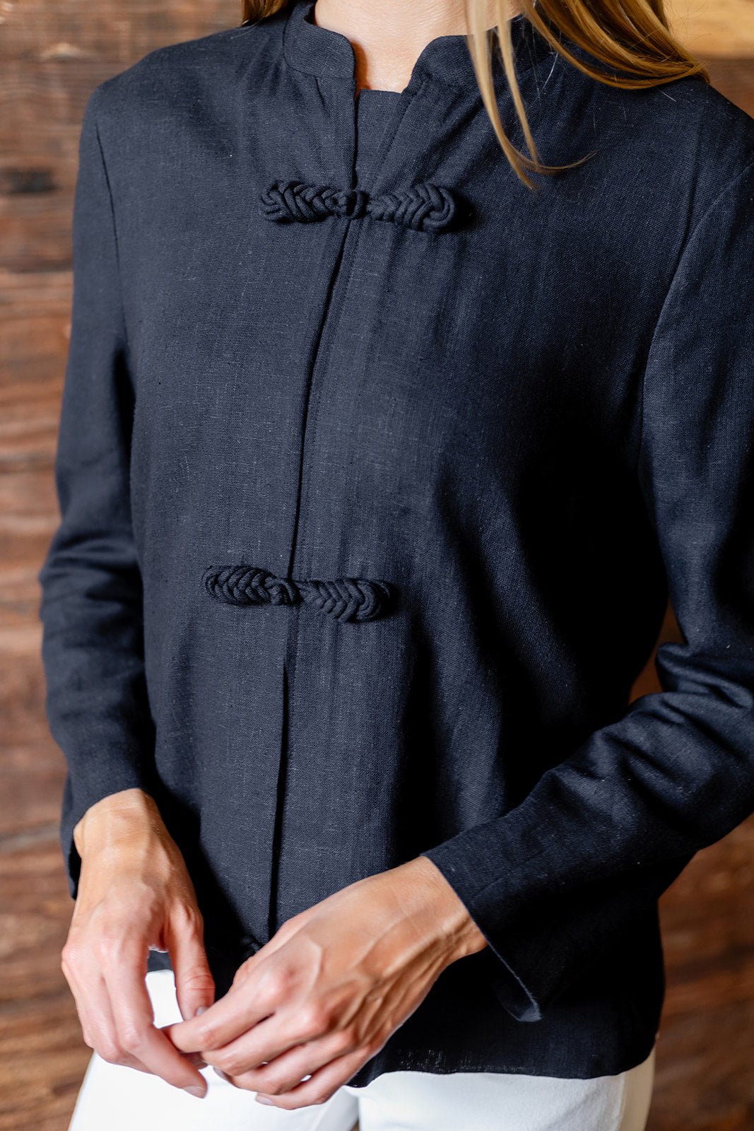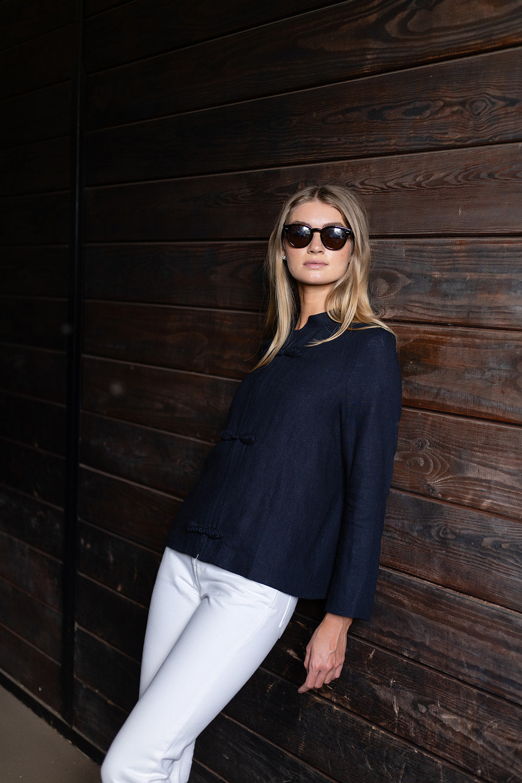 The Mandarin Jacket - now in Linen - is a chic mandarin collared jacket with front knot frog closures. We're loving the Mandarin to spice up a tippi and jeans daytime outfit or with a black cigarette and jewelry for a pulled-together but fun evening look. Hits below hip.