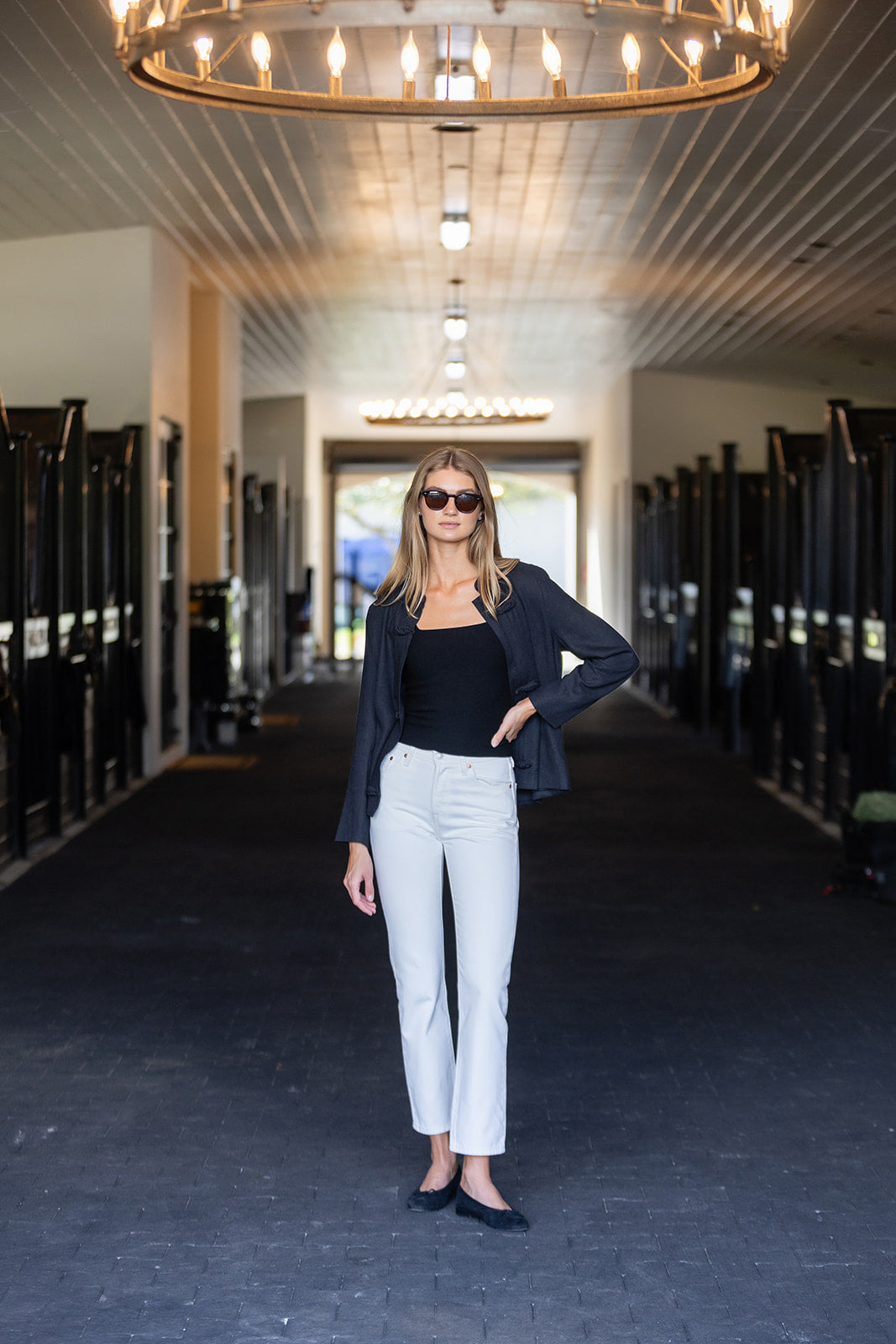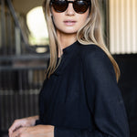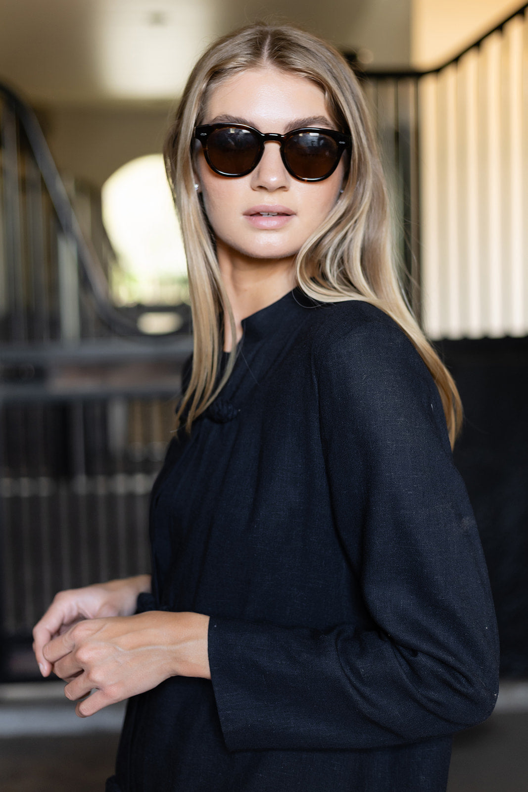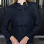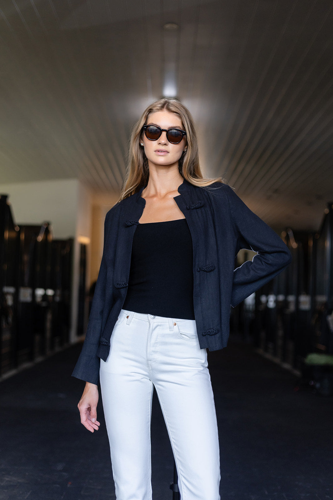 The Mandarin Jacket - now in Linen - is a chic mandarin collared jacket with front knot frog closures. We're loving the Mandarin to spice up a tippi and jeans daytime outfit or with a black cigarette and jewelry for a pulled-together but fun evening look. Hits below hip.