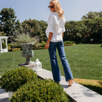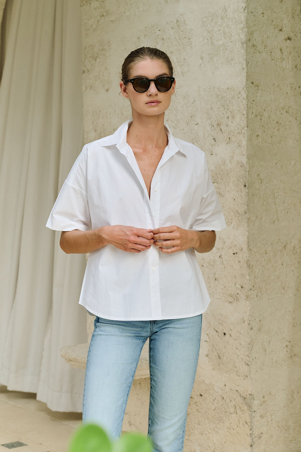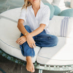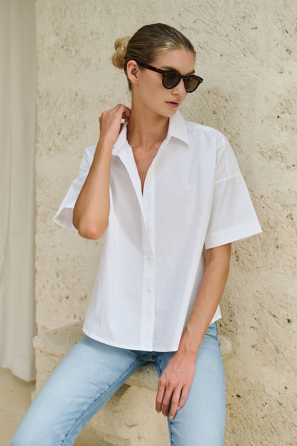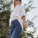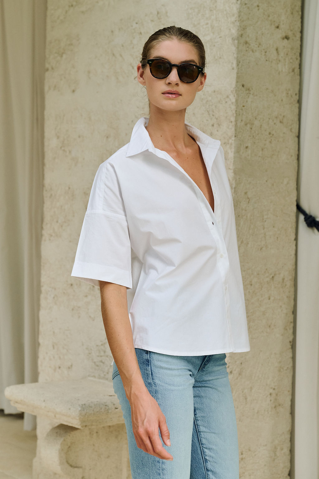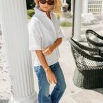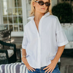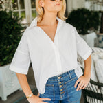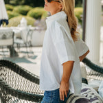 Meet the Marge Shirt, our new relaxed short sleeve button down inspired by the iconic wardrobe of Marge Sherwood (we're partial to Gwyneth's version). Features a drop shoulder, cuffed sleeve, and slightly longer length in the back, she can be tucked in to higher waisted styles or worn untucked for an effortless vibe. Made of 100% cotton poplin.